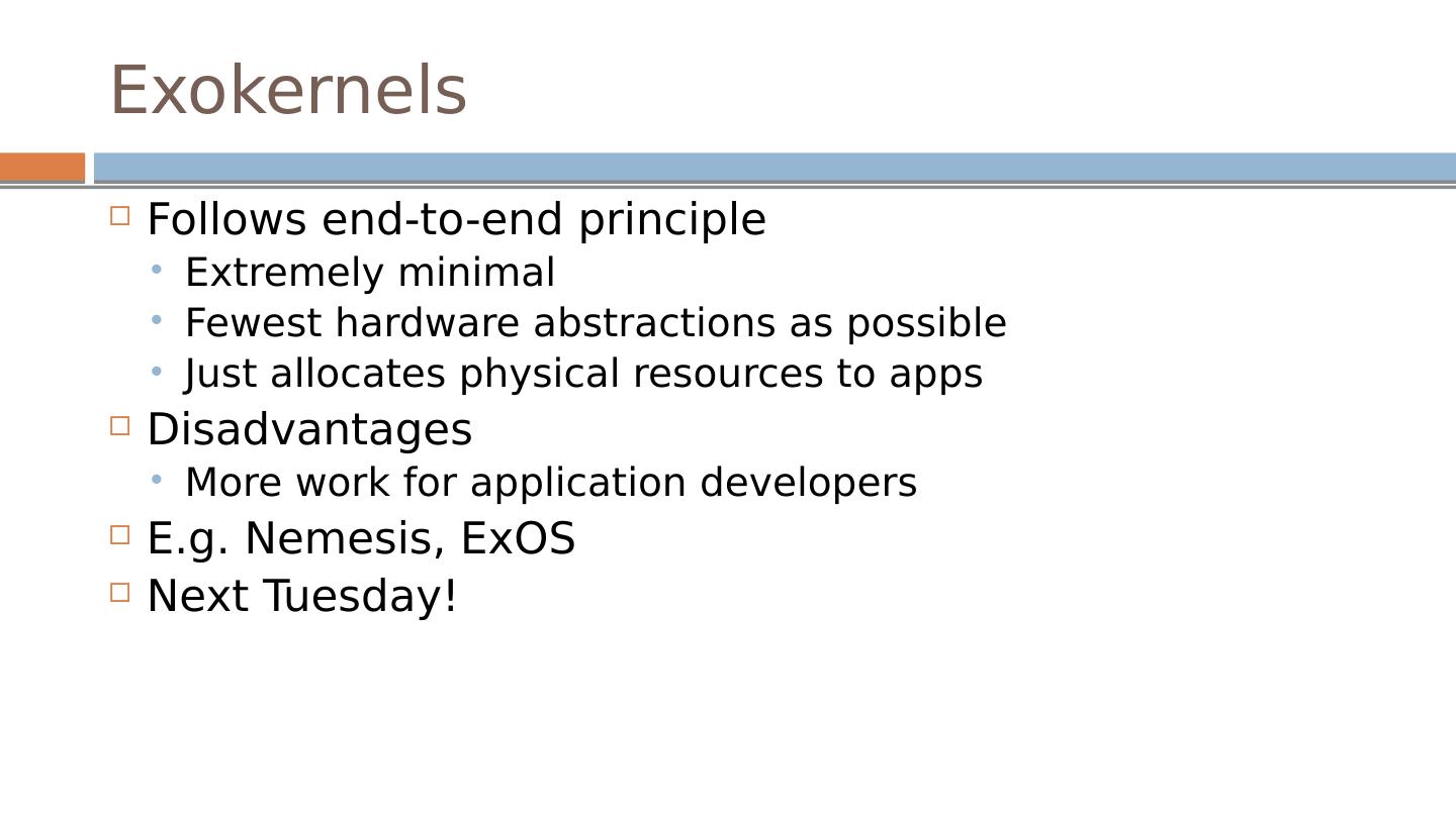 7 .Follows end-to-end principle Extremely minimal Fewest hardware abstractions as possible Just allocates physical resources to apps Disadvantages More work for application developers E.g. Nemesis, ExOS Next Tuesday! Exokernels