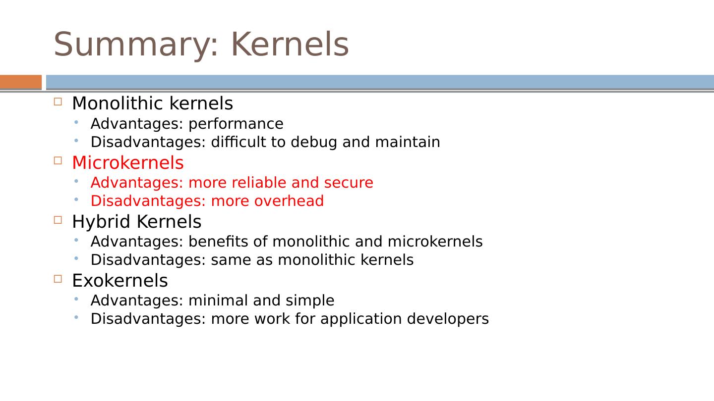 9 .Monolithic kernels Advantages: performance Disadvantages: difficult to debug and maintain Microkernels Advantages: more reliable and secure Disadvantages: more overhead Hybrid Kernels Advantages: benefits of monolithic and microkernels Disadvantages: same as monolithic kernels Exokernels Advantages: minimal and simple Disadvantages: more work for application developers Summary: Kernels