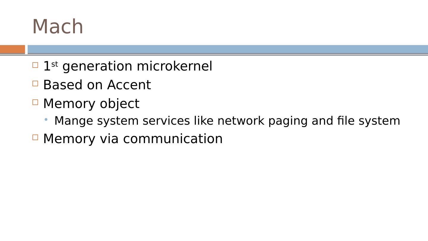 12 .1 st generation microkernel Based on Accent Memory object Mange system services like network paging and file system Memory via communication Mach