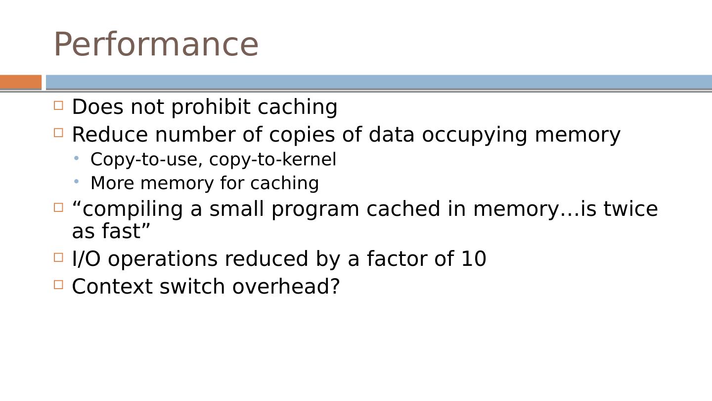 17 .Does not prohibit caching Reduce number of copies of data occupying memory Copy-to-use, copy-to-kernel More memory for caching “compiling a small program cached in memory…is twice as fast” I/O operations reduced by a factor of 10 Context switch overhead? Performance