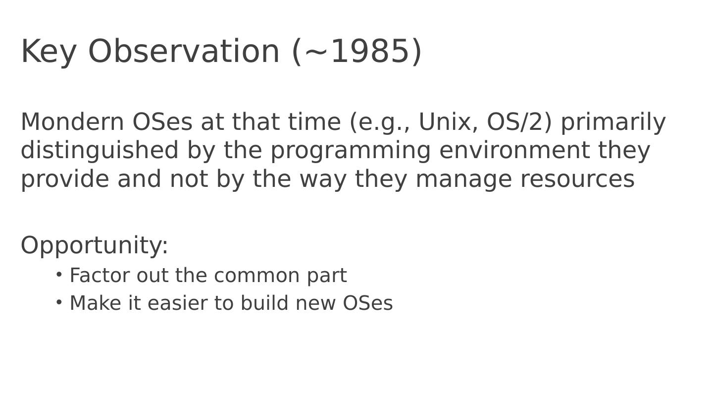 4 .Key Observation (~1985) Mondern OSes at that time (e.g ., Unix, OS/2) primarily distinguished by the programming environment they provide and not by the way they manage resources Opportunity: F actor out the common part Make it easier to build new OSes