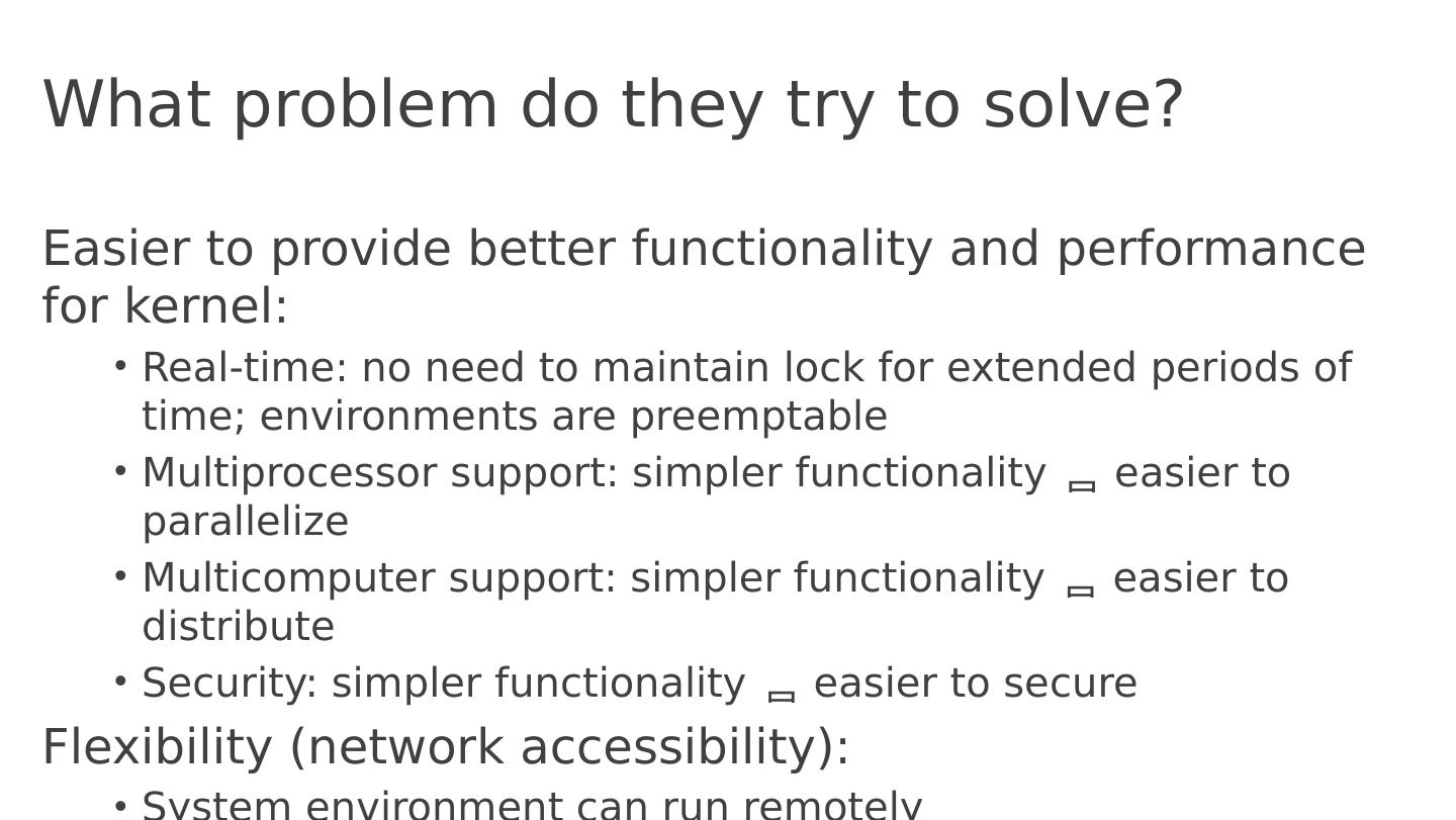 7 .What problem do they try to solve? Easier to provide better functionality and performance for kernel: Real-time: no need to maintain lock for extended periods of time; environments are preemptable Multiprocessor support: simpler functionality easier to parallelize Multicomputer support: simpler functionality easier to distribute Security: simpler functionality easier to secure Flexibility (network accessibility): System environment can run remotely