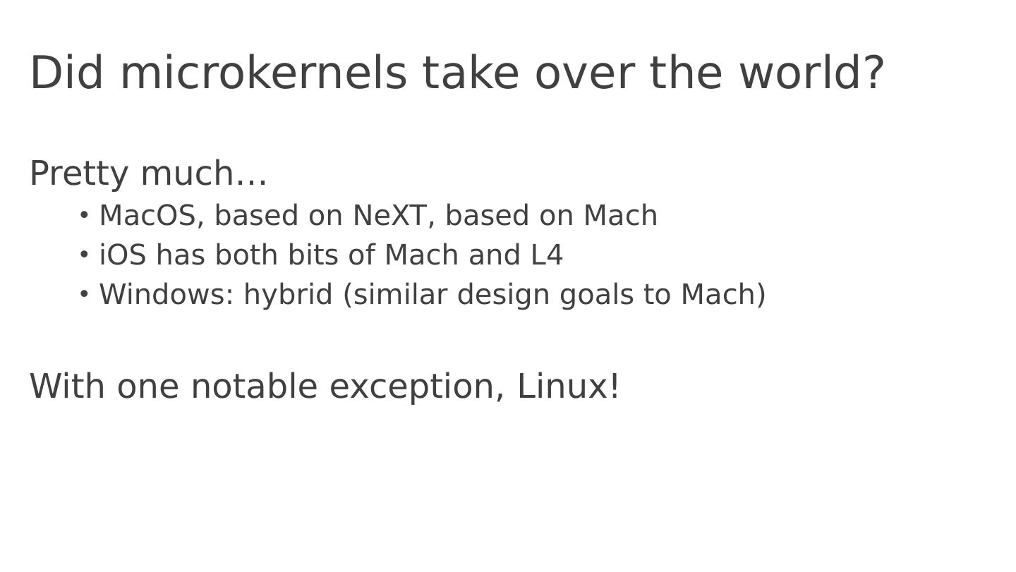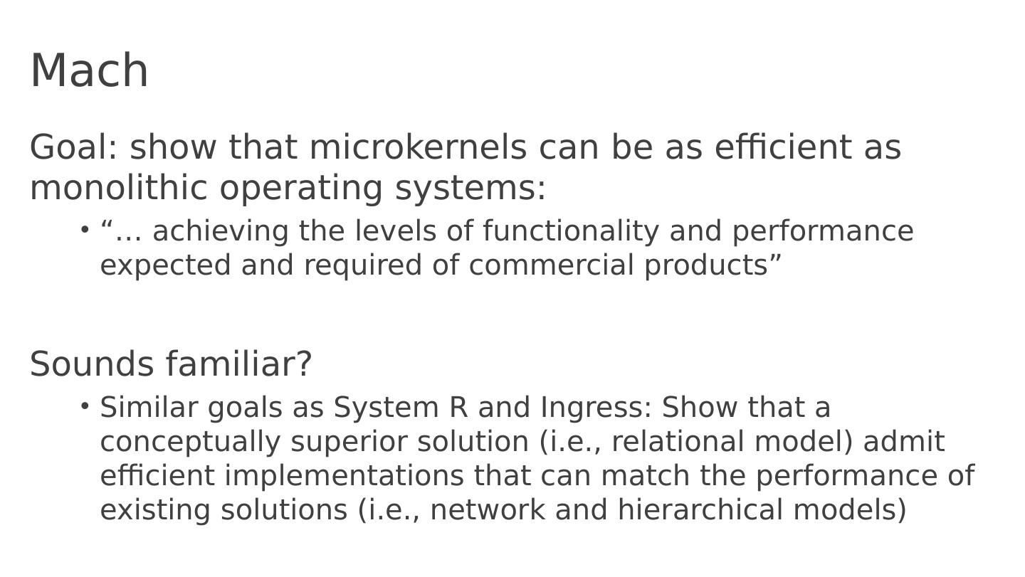 9 .Mach Goal: show that microkernels can be as efficient as monolithic operating systems: “ … achieving the levels of functionality and performance expected and required of commercial products” Sounds familiar? Similar goals as System R and Ingress: Show that a conceptually superior solution (i.e., relational model) admit efficient implementations that can match the performance of existing solutions (i.e., network and hierarchical models)