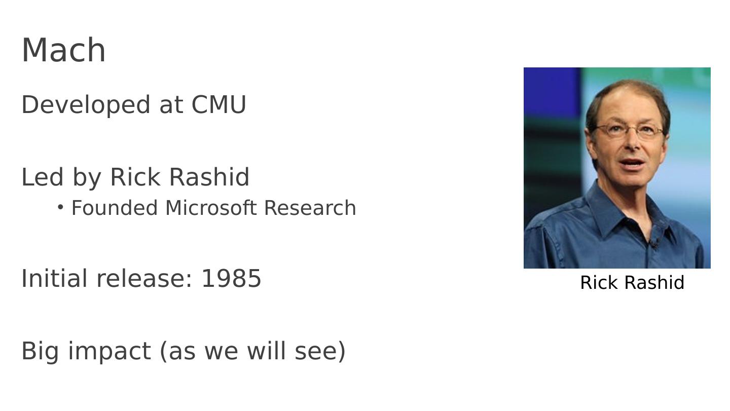10 .Mach Developed at CMU Led by Rick Rashid Founded Microsoft Research Initial release: 1985 Big impact (as we will see) Rick Rashid
