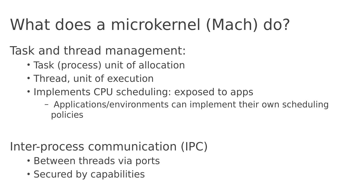 11 .What does a microkernel (Mach) do? Task and thread management: Task (process) unit of allocation Thread, unit of execution Implements CPU scheduling: exposed to apps Applications/environments can implement their own scheduling policies Inter-process communication (IPC) Between threads via ports Secured by capabilities