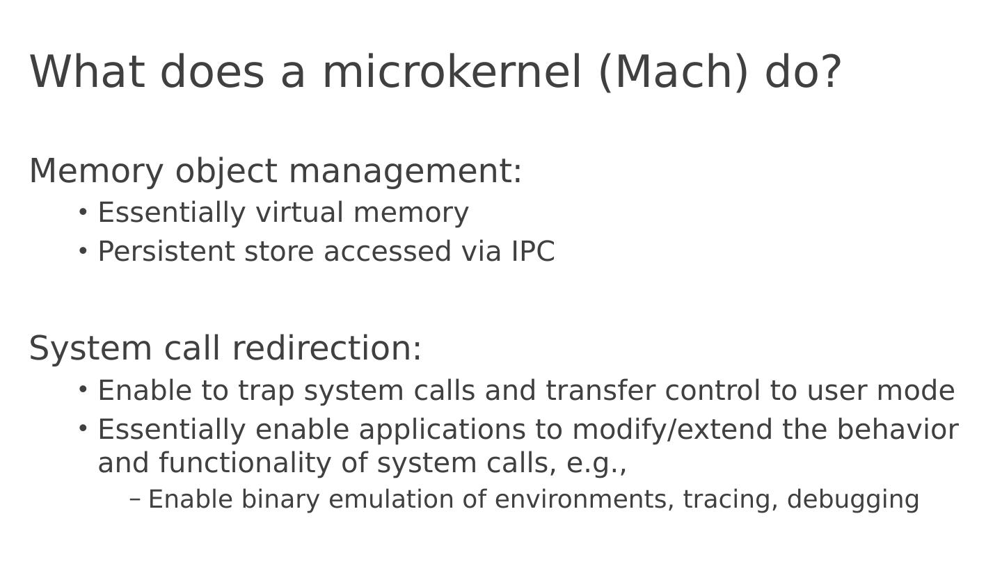 12 .What does a microkernel (Mach) do ? Memory object management: Essentially virtual memory Persistent store accessed via IPC System call redirection: Enable to trap system calls and transfer control to user mode Essentially enable applications to modify/extend the behavior and functionality of system calls, e.g., Enable binary emulation of environments, tracing, debugging