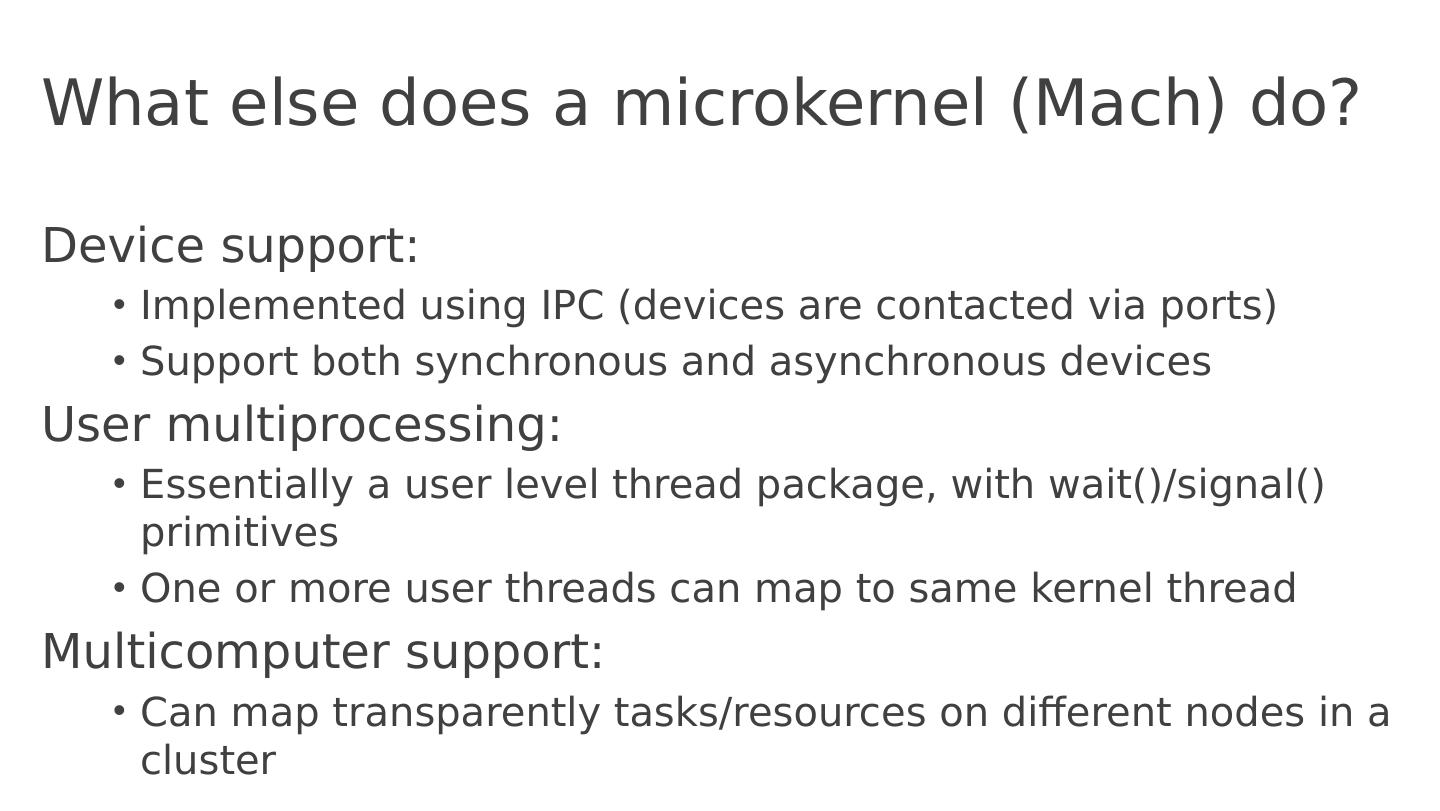 13 .What else does a microkernel (Mach) do ? Device support: Implemented using IPC (devices are contacted via ports) Support both synchronous and asynchronous devices User multiprocessing: Essentially a user level thread package, with wait()/signal() primitives One or more user threads can map to same kernel thread Multicomputer support: Can map transparently tasks/resources on different nodes in a cluster