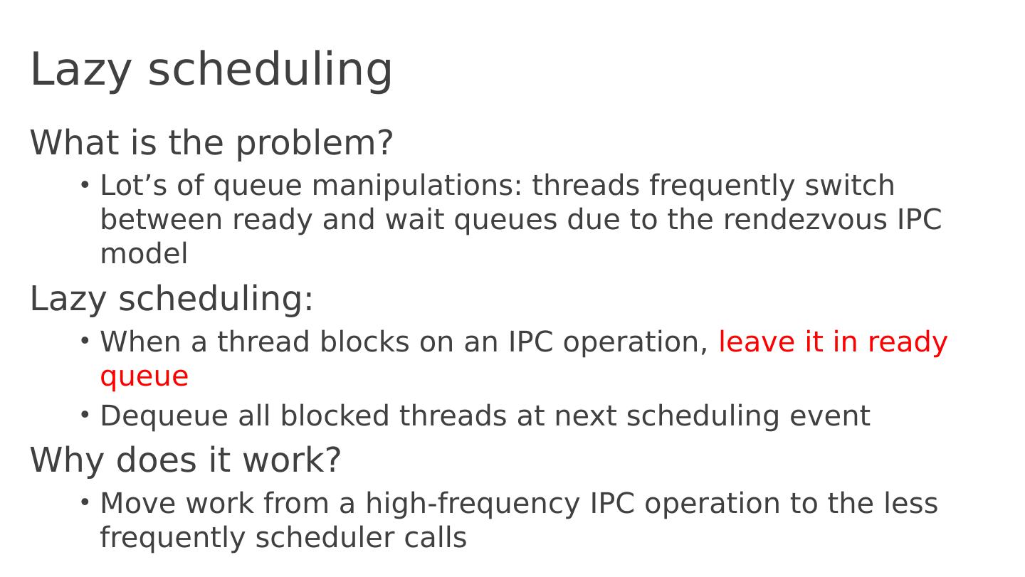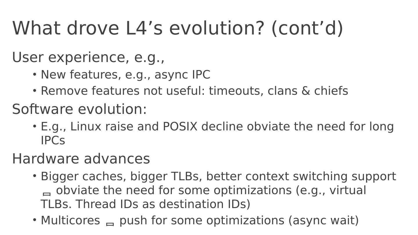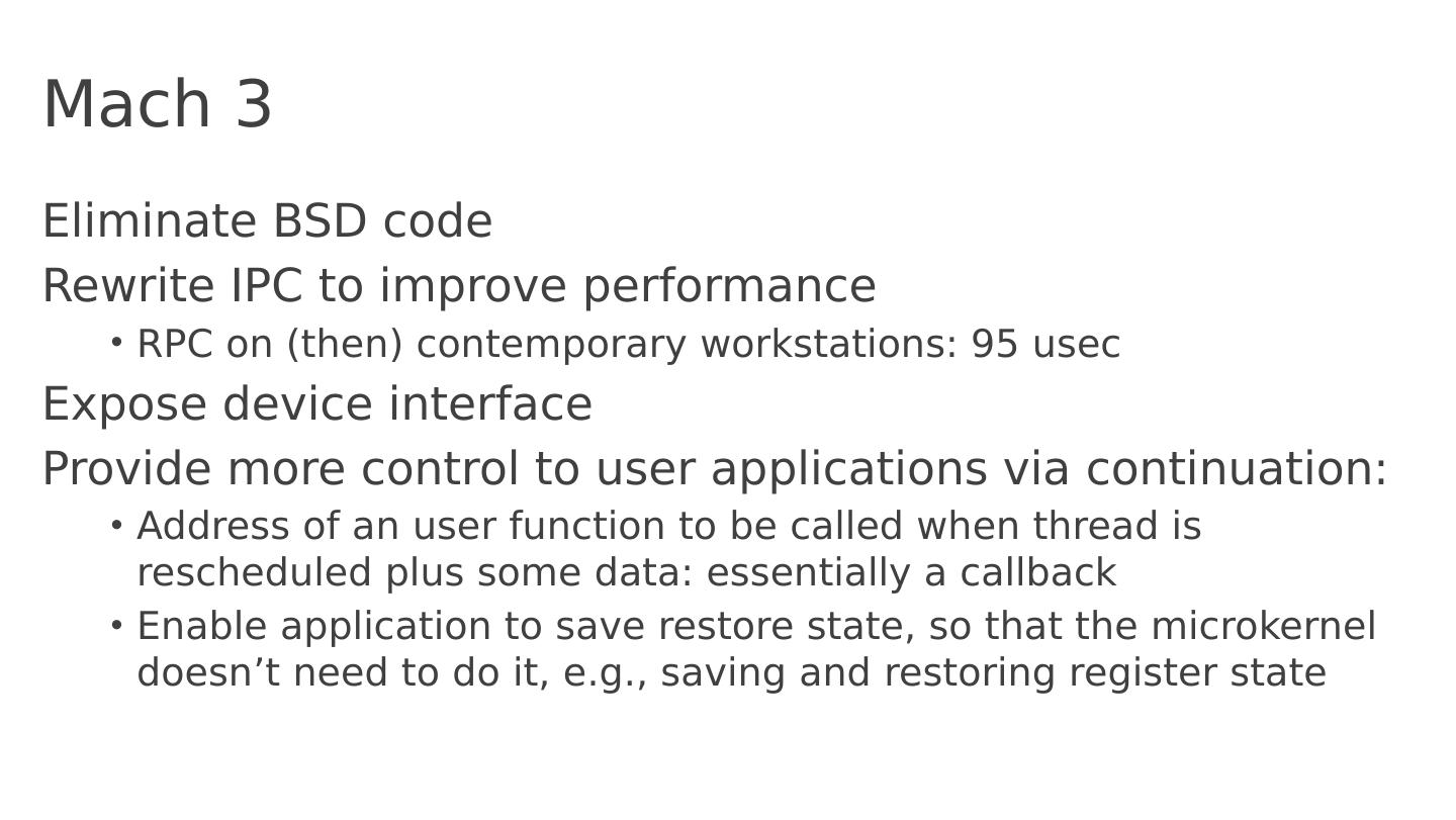 15 .Mach 3 Eliminate BSD code R ewrite IPC to improve performance RPC on (then) contemporary workstations: 95 usec Expose device interface Provide more control to user applications via continuation: A ddress of an user function to be called when thread is rescheduled plus some data: essentially a callback Enable application to save restore state, so that the microkernel doesn’t need to do it, e.g., saving and restoring register state