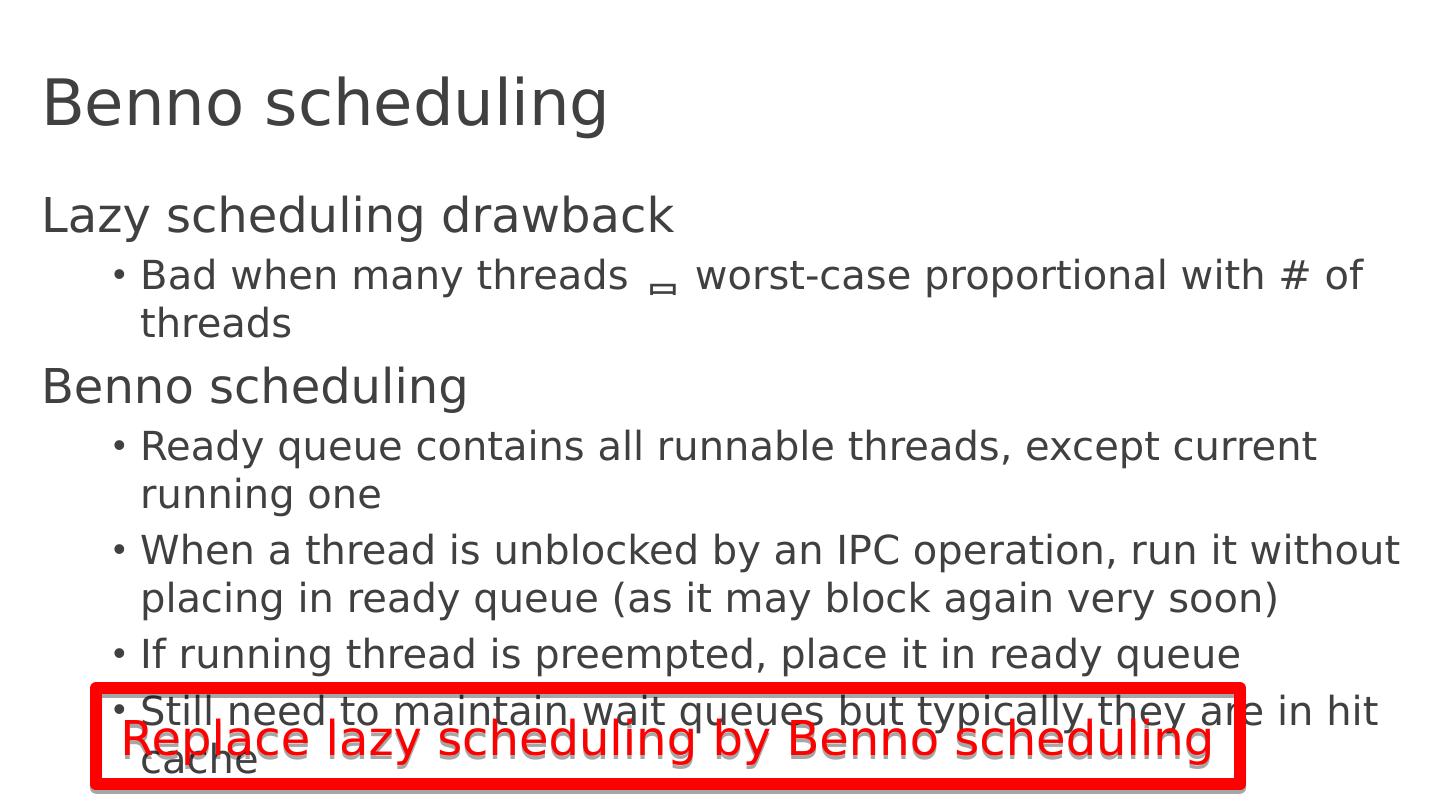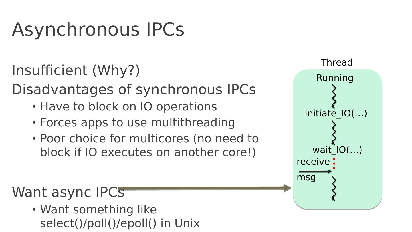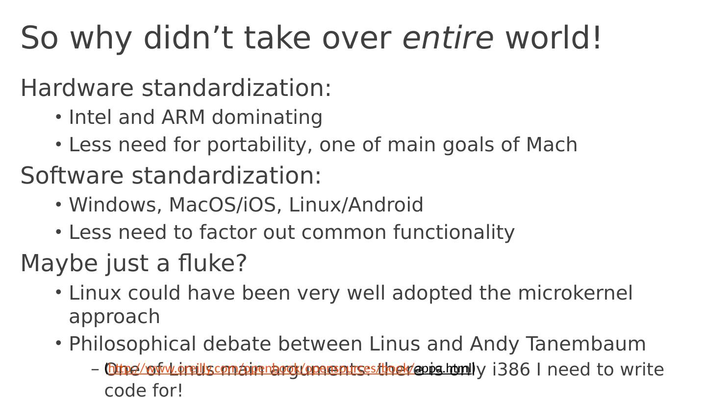 15 .Mach 3 Eliminate BSD code R ewrite IPC to improve performance RPC on (then) contemporary workstations: 95 usec Expose device interface Provide more control to user applications via continuation: A ddress of an user function to be called when thread is rescheduled plus some data: essentially a callback Enable application to save restore state, so that the microkernel doesn’t need to do it, e.g., saving and restoring register state