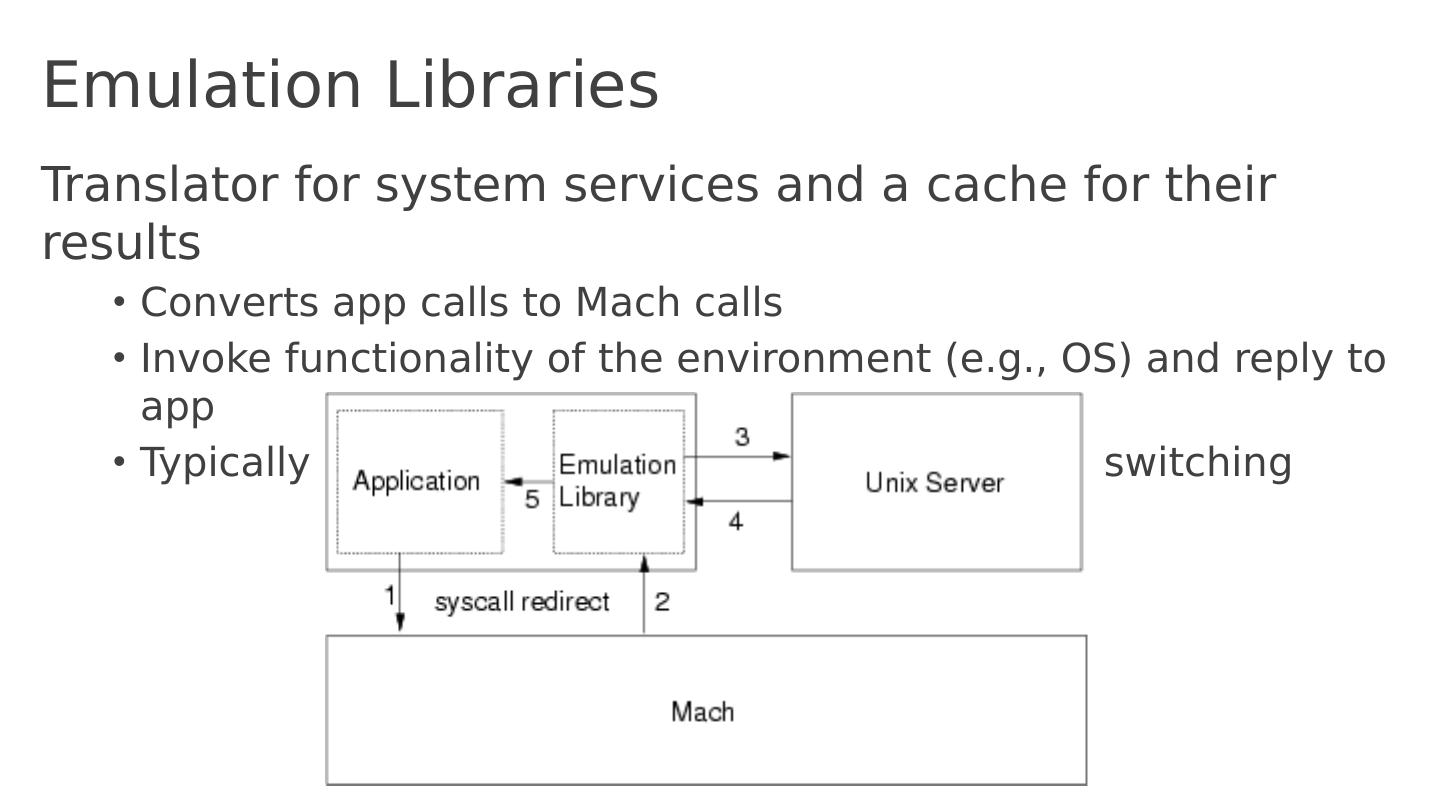 17 .Emulation Libraries Translator for system services and a cache for their results Converts app calls to Mach calls Invoke functionality of the environment (e.g., OS) and reply to app Typically linked to app to avoid another context switching