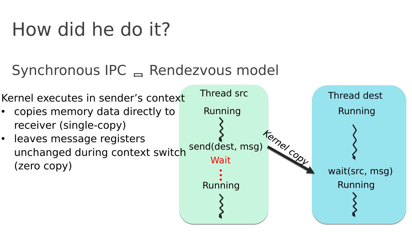 24 .How did he do it? Synchronous IPC Rendezvous model s end( dest , msg ) Running Thread src Thread dest wait( src , msg ) Running Running Running Wait … Kernel copy Kernel executes in sender’s context copies memory data directly to receiver ( single-copy ) leaves message registers unchanged during context switch ( zero copy )