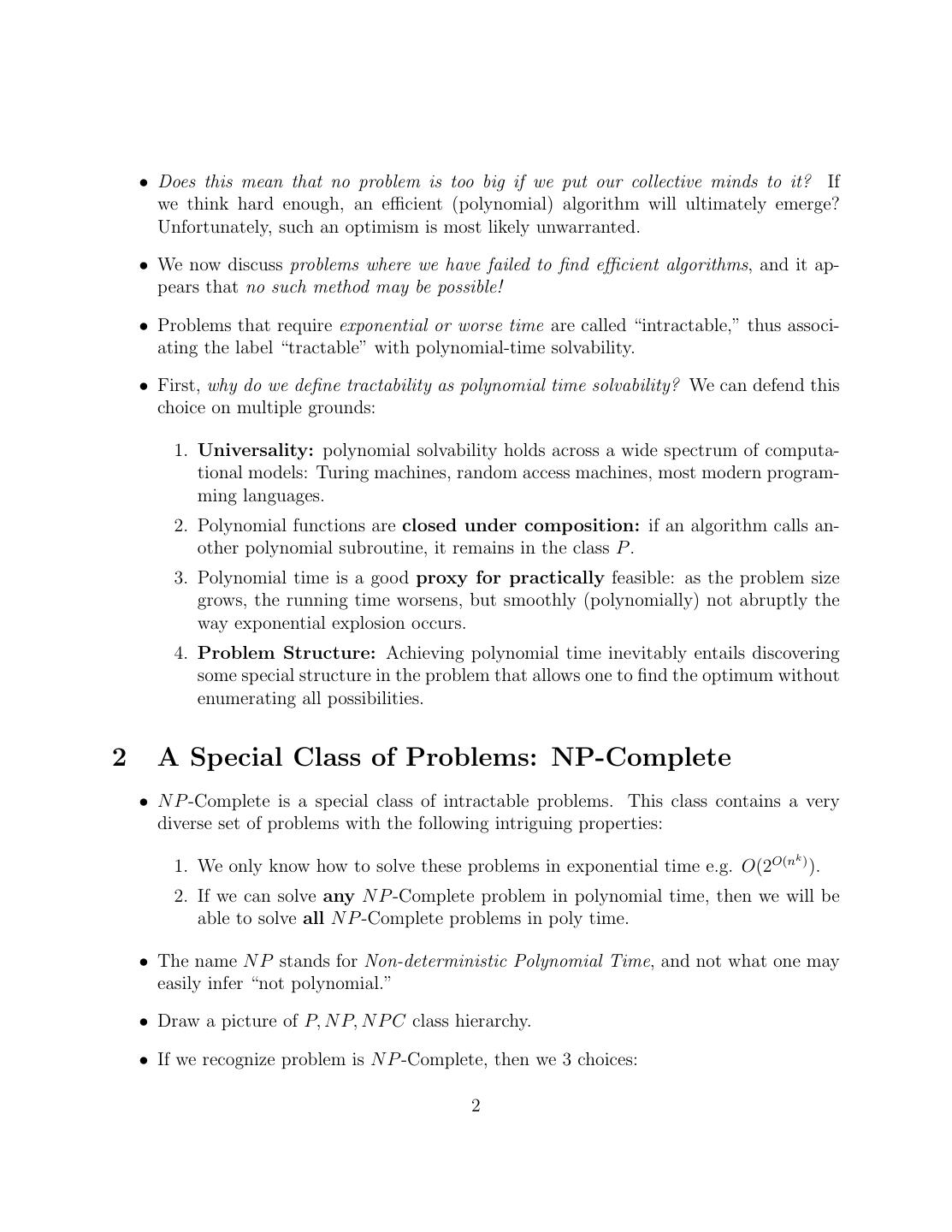 2 . • Does this mean that no problem is too big if we put our collective minds to it? If we think hard enough, an efficient (polynomial) algorithm will ultimately emerge? Unfortunately, such an optimism is most likely unwarranted. • We now discuss problems where we have failed to find efficient algorithms, and it ap- pears that no such method may be possible! • Problems that require exponential or worse time are called “intractable,” thus associ- ating the label “tractable” with polynomial-time solvability. • First, why do we define tractability as polynomial time solvability? We can defend this choice on multiple grounds: 1. Universality: polynomial solvability holds across a wide spectrum of computa- tional models: Turing machines, random access machines, most modern program- ming languages. 2. Polynomial functions are closed under composition: if an algorithm calls an- other polynomial subroutine, it remains in the class P . 3. Polynomial time is a good proxy for practically feasible: as the problem size grows, the running time worsens, but smoothly (polynomially) not abruptly the way exponential explosion occurs. 4. Problem Structure: Achieving polynomial time inevitably entails discovering some special structure in the problem that allows one to find the optimum without enumerating all possibilities. 2 A Special Class of Problems: NP-Complete • N P -Complete is a special class of intractable problems. This class contains a very diverse set of problems with the following intriguing properties: k 1. We only know how to solve these problems in exponential time e.g. O(2O(n ) ). 2. If we can solve any N P -Complete problem in polynomial time, then we will be able to solve all N P -Complete problems in poly time. • The name N P stands for Non-deterministic Polynomial Time, and not what one may easily infer “not polynomial.” • Draw a picture of P, N P, N P C class hierarchy. • If we recognize problem is N P -Complete, then we 3 choices: 2