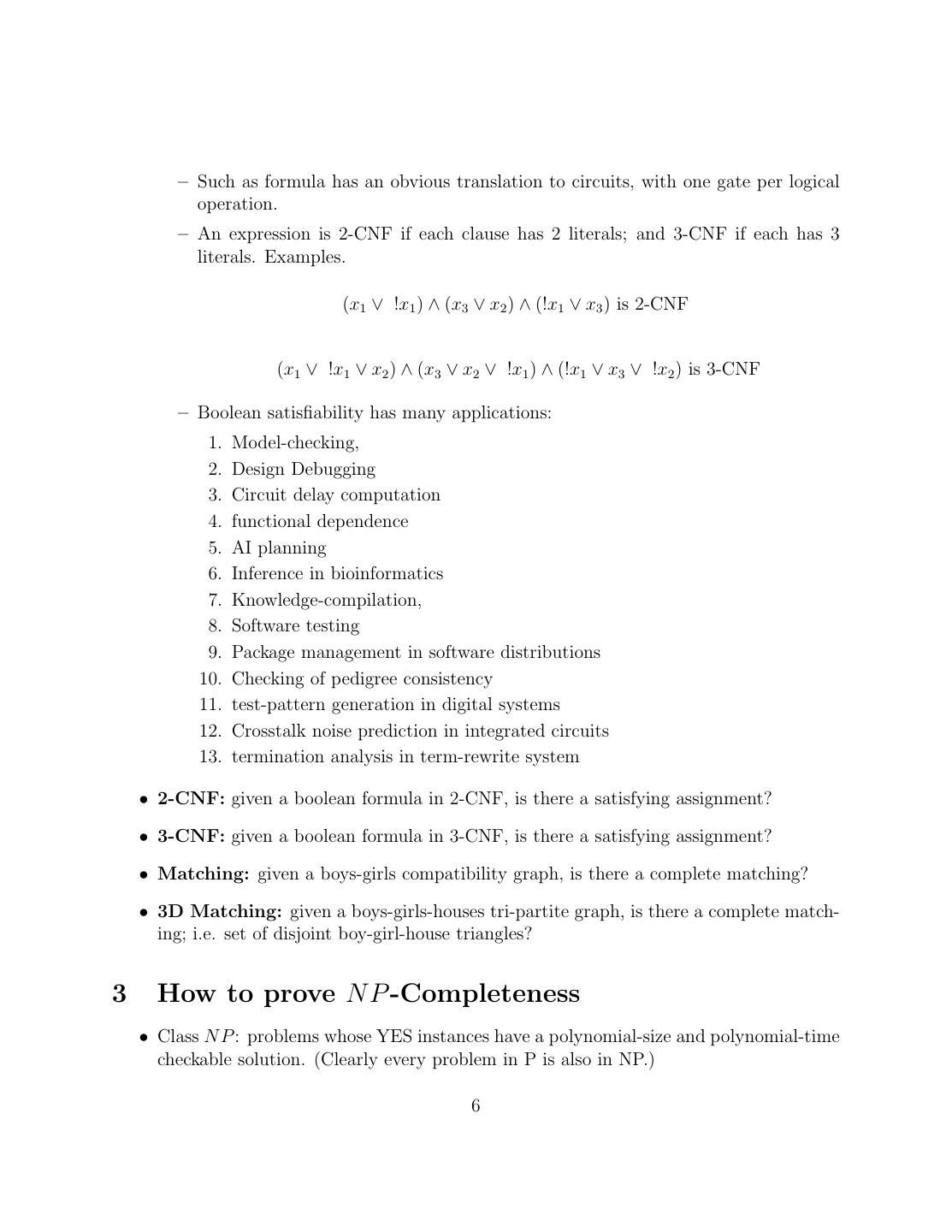 6 . – Such as formula has an obvious translation to circuits, with one gate per logical operation. – An expression is 2-CNF if each clause has 2 literals; and 3-CNF if each has 3 literals. Examples. (x1 ∨ !x1 ) ∧ (x3 ∨ x2 ) ∧ (!x1 ∨ x3 ) is 2-CNF (x1 ∨ !x1 ∨ x2 ) ∧ (x3 ∨ x2 ∨ !x1 ) ∧ (!x1 ∨ x3 ∨ !x2 ) is 3-CNF – Boolean satisfiability has many applications: 1. Model-checking, 2. Design Debugging 3. Circuit delay computation 4. functional dependence 5. AI planning 6. Inference in bioinformatics 7. Knowledge-compilation, 8. Software testing 9. Package management in software distributions 10. Checking of pedigree consistency 11. test-pattern generation in digital systems 12. Crosstalk noise prediction in integrated circuits 13. termination analysis in term-rewrite system • 2-CNF: given a boolean formula in 2-CNF, is there a satisfying assignment? • 3-CNF: given a boolean formula in 3-CNF, is there a satisfying assignment? • Matching: given a boys-girls compatibility graph, is there a complete matching? • 3D Matching: given a boys-girls-houses tri-partite graph, is there a complete match- ing; i.e. set of disjoint boy-girl-house triangles? 3 How to prove N P -Completeness • Class N P : problems whose YES instances have a polynomial-size and polynomial-time checkable solution. (Clearly every problem in P is also in NP.) 6