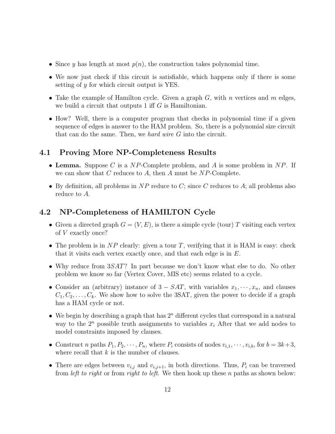 12 . • Since y has length at most p(n), the construction takes polynomial time. • We now just check if this circuit is satisfiable, which happens only if there is some setting of y for which circuit output is YES. • Take the example of Hamilton cycle. Given a graph G, with n vertices and m edges, we build a circuit that outputs 1 iff G is Hamiltonian. • How? Well, there is a computer program that checks in polynomial time if a given sequence of edges is answer to the HAM problem. So, there is a polynomial size circuit that can do the same. Then, we hard wire G into the circuit. 4.1 Proving More NP-Completeness Results • Lemma. Suppose C is a N P -Complete problem, and A is some problem in N P . If we can show that C reduces to A, then A must be N P -Complete. • By definition, all problems in N P reduce to C; since C reduces to A; all problems also reduce to A. 4.2 NP-Completeness of HAMILTON Cycle • Given a directed graph G = (V, E), is there a simple cycle (tour) T visiting each vertex of V exactly once? • The problem is in N P clearly: given a tour T , verifying that it is HAM is easy: check that it visits each vertex exactly once, and that each edge is in E. • Why reduce from 3SAT ? In part because we don’t know what else to do. No other problem we know so far (Vertex Cover, MIS etc) seems related to a cycle. • Consider an (arbitrary) instance of 3 − SAT , with variables x1 , · · · , xn , and clauses C1 , C2 , . . . , Ck . We show how to solve the 3SAT, given the power to decide if a graph has a HAM cycle or not. • We begin by describing a graph that has 2n different cycles that correspond in a natural way to the 2n possible truth assignments to variables xi After that we add nodes to model constraints imposed by clauses. • Construct n paths P1 , P2 , · · · , Pn , where Pi consists of nodes vi,1 , · · · , vi,b , for b = 3k +3, where recall that k is the number of clauses. • There are edges between vi,j and vi,j+1 , in both directions. Thus, Pi can be traversed from left to right or from right to left. We then hook up these n paths as shown below: 12