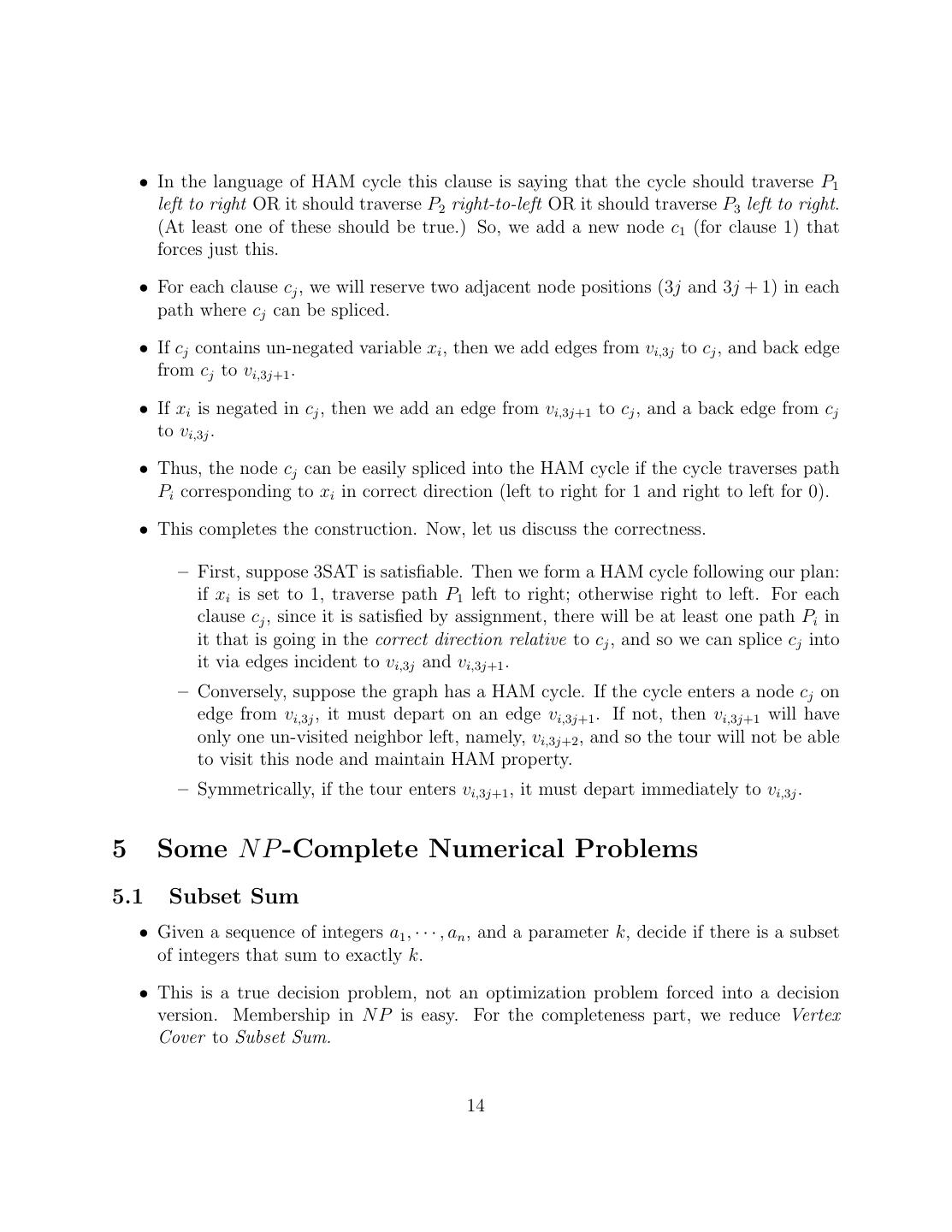 14 . • In the language of HAM cycle this clause is saying that the cycle should traverse P1 left to right OR it should traverse P2 right-to-left OR it should traverse P3 left to right. (At least one of these should be true.) So, we add a new node c1 (for clause 1) that forces just this. • For each clause cj , we will reserve two adjacent node positions (3j and 3j + 1) in each path where cj can be spliced. • If cj contains un-negated variable xi , then we add edges from vi,3j to cj , and back edge from cj to vi,3j+1 . • If xi is negated in cj , then we add an edge from vi,3j+1 to cj , and a back edge from cj to vi,3j . • Thus, the node cj can be easily spliced into the HAM cycle if the cycle traverses path Pi corresponding to xi in correct direction (left to right for 1 and right to left for 0). • This completes the construction. Now, let us discuss the correctness. – First, suppose 3SAT is satisfiable. Then we form a HAM cycle following our plan: if xi is set to 1, traverse path P1 left to right; otherwise right to left. For each clause cj , since it is satisfied by assignment, there will be at least one path Pi in it that is going in the correct direction relative to cj , and so we can splice cj into it via edges incident to vi,3j and vi,3j+1 . – Conversely, suppose the graph has a HAM cycle. If the cycle enters a node cj on edge from vi,3j , it must depart on an edge vi,3j+1 . If not, then vi,3j+1 will have only one un-visited neighbor left, namely, vi,3j+2 , and so the tour will not be able to visit this node and maintain HAM property. – Symmetrically, if the tour enters vi,3j+1 , it must depart immediately to vi,3j . 5 Some N P -Complete Numerical Problems 5.1 Subset Sum • Given a sequence of integers a1 , · · · , an , and a parameter k, decide if there is a subset of integers that sum to exactly k. • This is a true decision problem, not an optimization problem forced into a decision version. Membership in N P is easy. For the completeness part, we reduce Vertex Cover to Subset Sum. 14