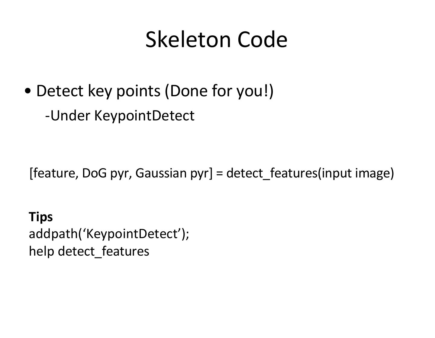 7 . Skeleton Code • Detect key points (Done for you!) -‐Under KeypointDetect [feature, DoG pyr, Gaussian pyr] = detect_features(input image) Tips addpath(‘KeypointDetect’); help detect_features