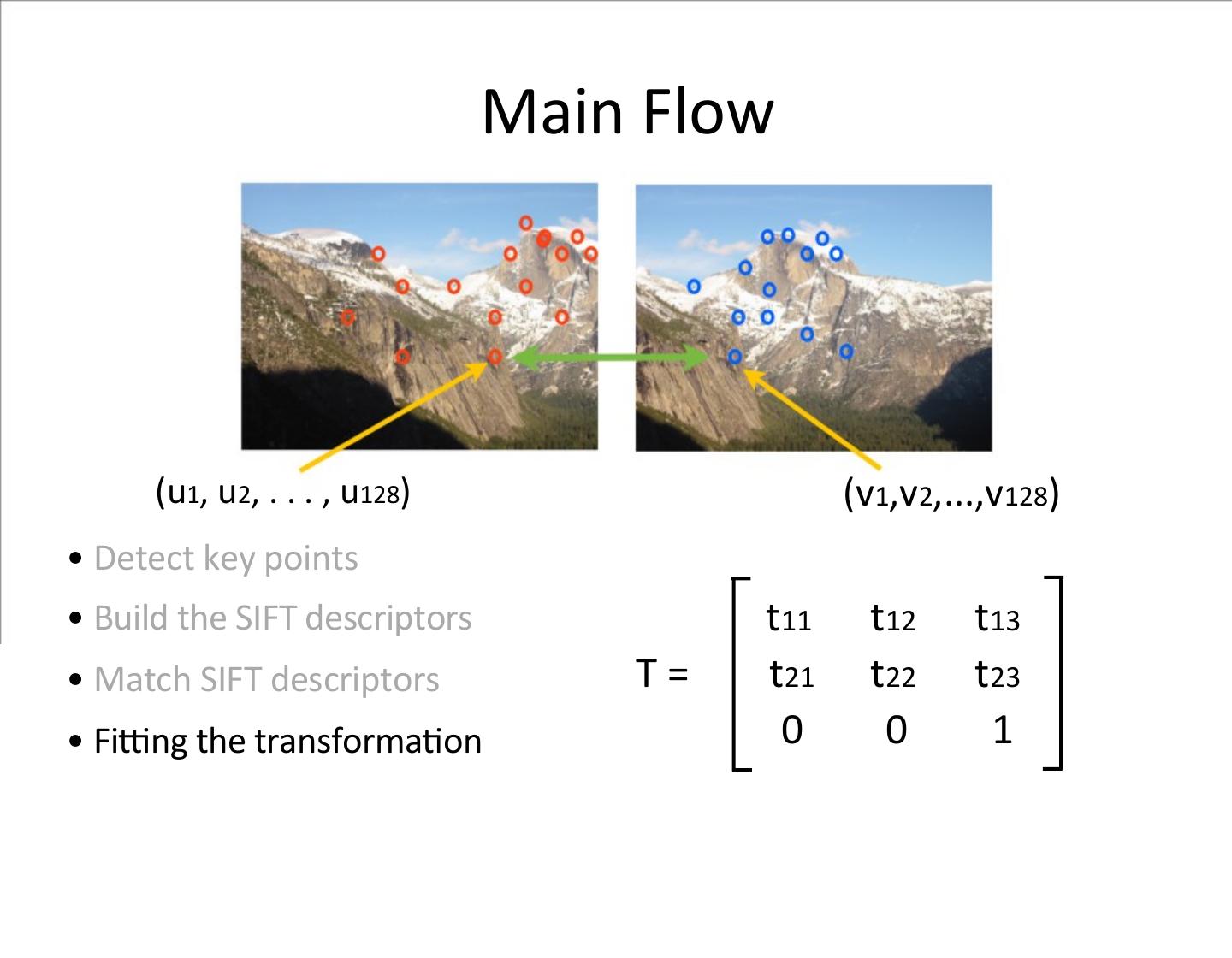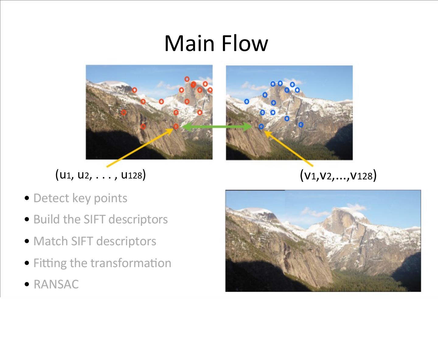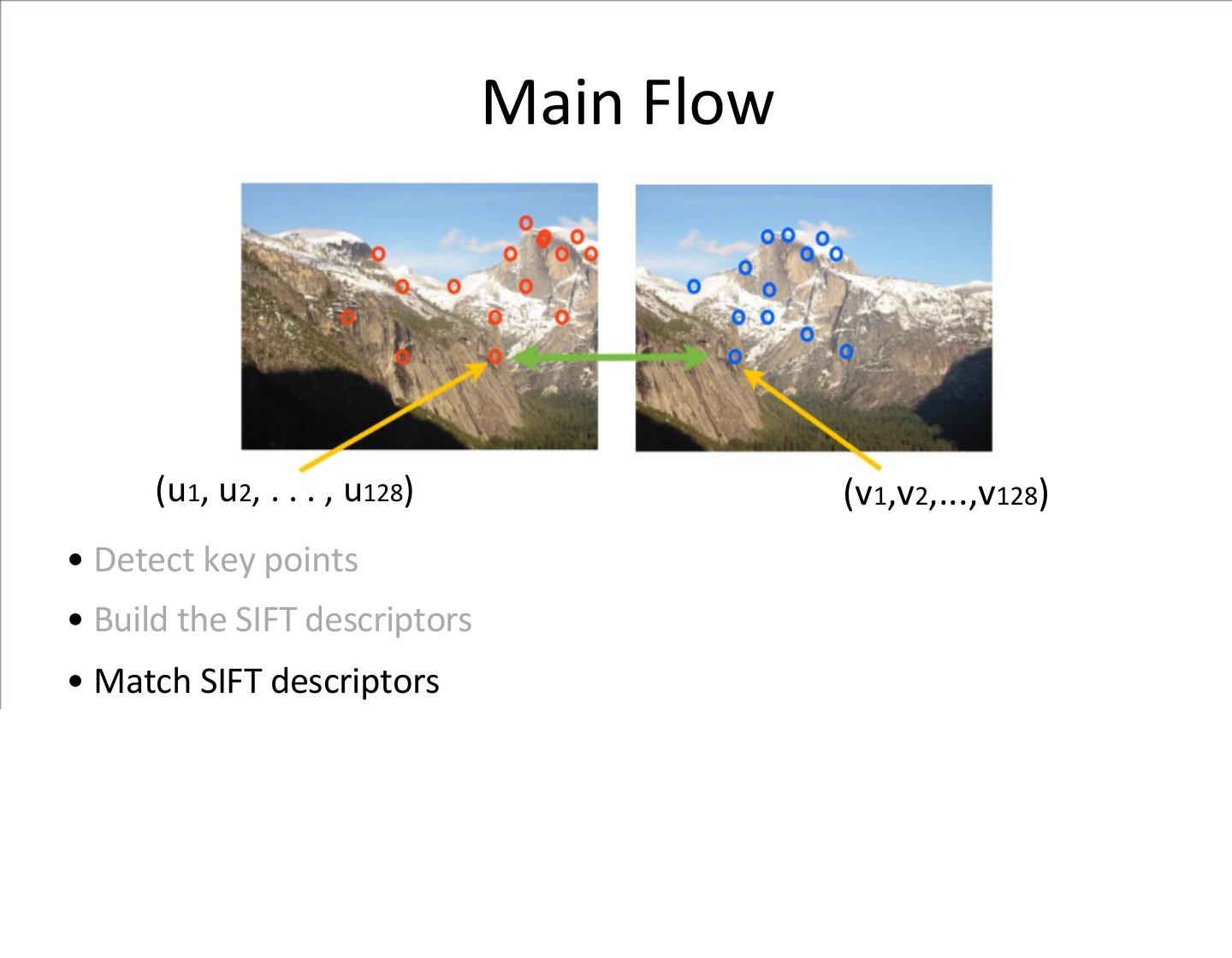 12 . Main Flow (u1, u2, . . . , u128) (v1,v2,...,v128) • Detect key points • Build the SIFT descriptors • Match SIFT descriptors