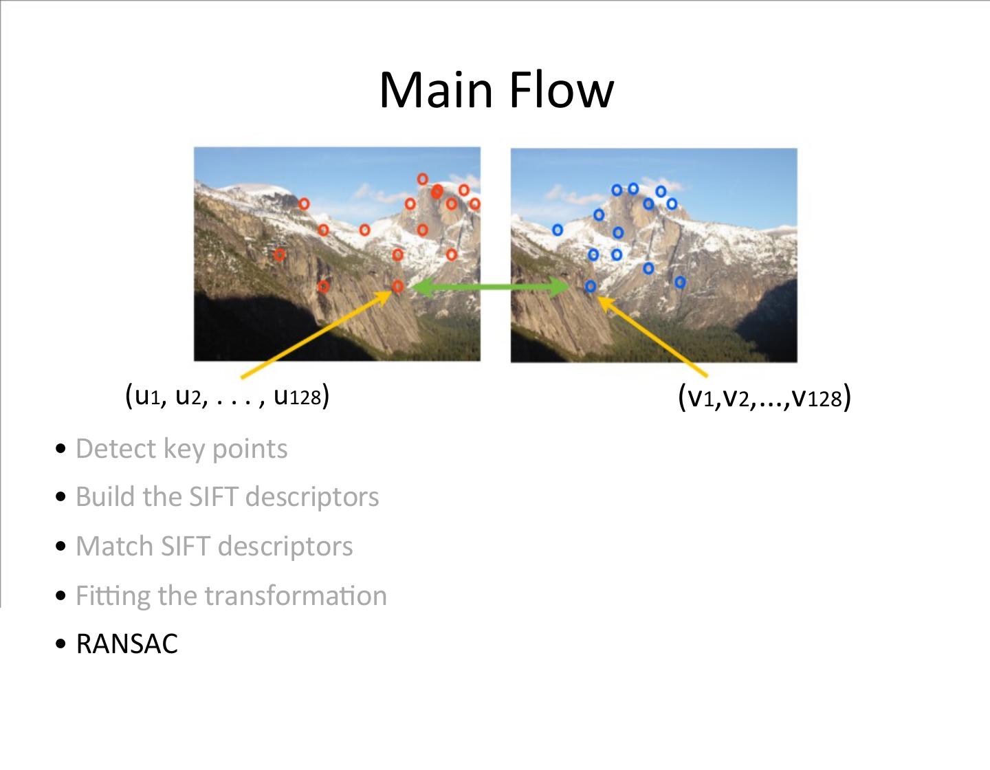 21 . Main Flow (u1, u2, . . . , u128) (v1,v2,...,v128) • Detect key points • Build the SIFT descriptors • Match SIFT descriptors • FiTng the transforma1on • RANSAC