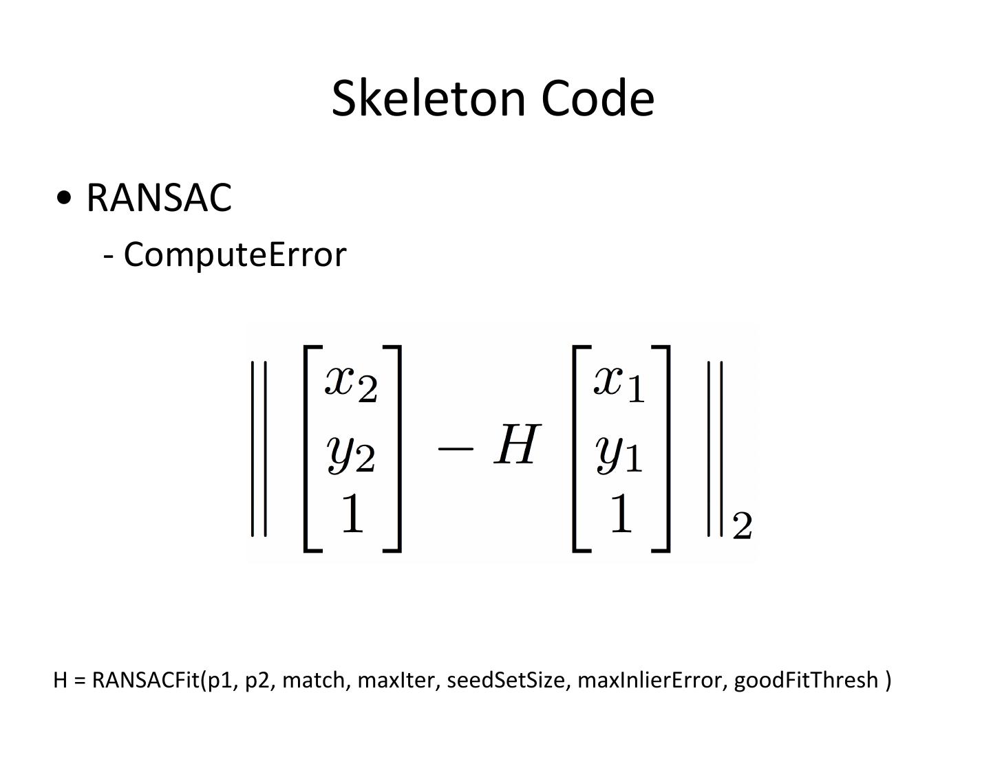 20 . Skeleton Code • RANSAC -‐ ComputeError H = RANSACFit(p1, p2, match, maxIter, seedSetSize, maxInlierError, goodFitThresh )