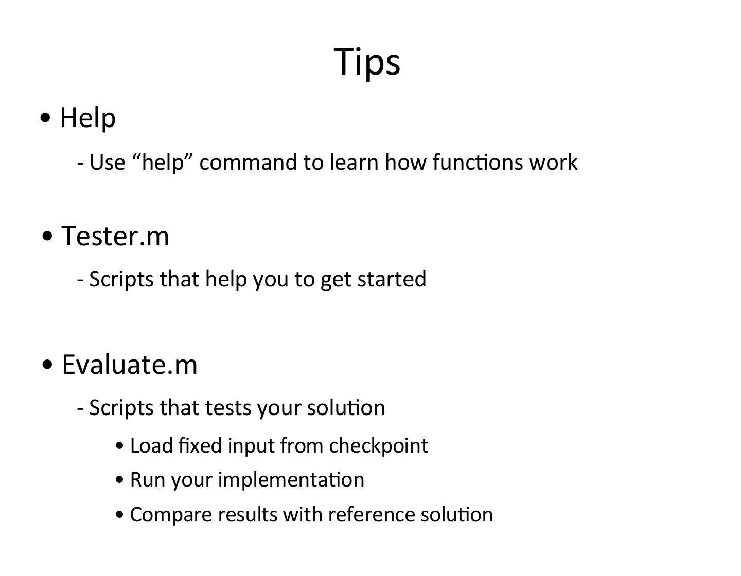 23 . Tips • Help -‐ Use “help” command to learn how func1ons work • Tester.m -‐ Scripts that help you to get started • Evaluate.m -‐ Scripts that tests your solu1on • Load fixed input from checkpoint • Run your implementa1on • Compare results with reference solu1on