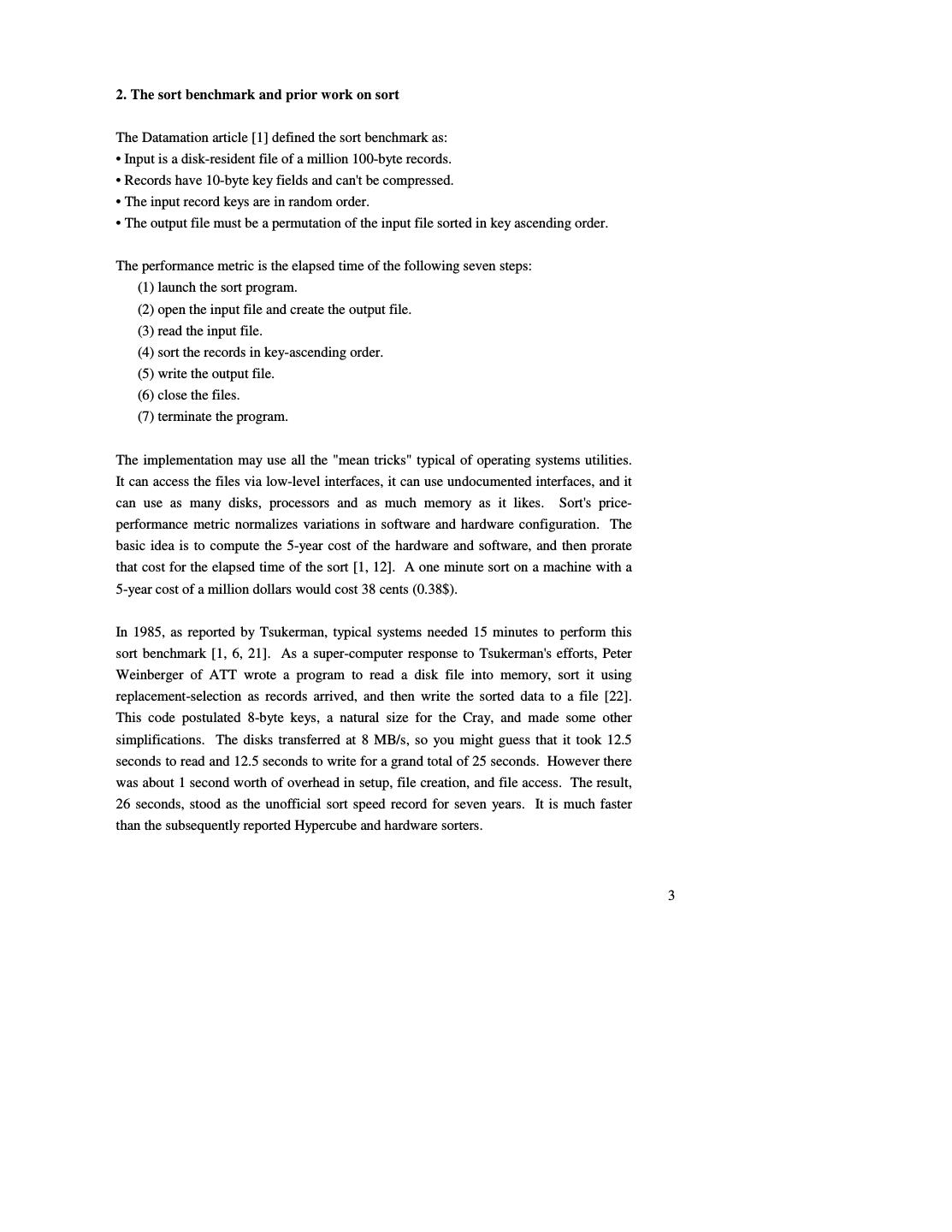 3 .2. The sort benchmark and prior work on sort The Datamation article [1] defined the sort benchmark as: • Input is a disk-resident file of a million 100-byte records. • Records have 10-byte key fields and can't be compressed. • The input record keys are in random order. • The output file must be a permutation of the input file sorted in key ascending order. The performance metric is the elapsed time of the following seven steps: (1) launch the sort program. (2) open the input file and create the output file. (3) read the input file. (4) sort the records in key-ascending order. (5) write the output file. (6) close the files. (7) terminate the program. The implementation may use all the "mean tricks" typical of operating systems utilities. It can access the files via low-level interfaces, it can use undocumented interfaces, and it can use as many disks, processors and as much memory as it likes. Sort's price- performance metric normalizes variations in software and hardware configuration. The basic idea is to compute the 5-year cost of the hardware and software, and then prorate that cost for the elapsed time of the sort [1, 12]. A one minute sort on a machine with a 5-year cost of a million dollars would cost 38 cents (0.38$). In 1985, as reported by Tsukerman, typical systems needed 15 minutes to perform this sort benchmark [1, 6, 21]. As a super-computer response to Tsukerman's efforts, Peter Weinberger of ATT wrote a program to read a disk file into memory, sort it using replacement-selection as records arrived, and then write the sorted data to a file [22]. This code postulated 8-byte keys, a natural size for the Cray, and made some other simplifications. The disks transferred at 8 MB/s, so you might guess that it took 12.5 seconds to read and 12.5 seconds to write for a grand total of 25 seconds. However there was about 1 second worth of overhead in setup, file creation, and file access. The result, 26 seconds, stood as the unofficial sort speed record for seven years. It is much faster than the subsequently reported Hypercube and hardware sorters. 3