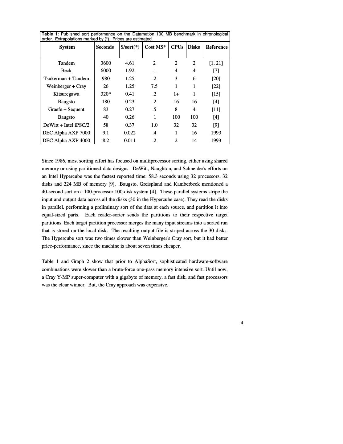 4 .Table 1: Published sort performance on the Datamation 100 MB benchmark in chronological order. Extrapolations marked by (*). Prices are estimated. System Seconds $/sort(*) Cost M$* CPUs Disks Reference Tandem 3600 4.61 2 2 2 [1, 21] Beck 6000 1.92 .1 4 4 [7] Tsukerman + Tandem 980 1.25 .2 3 6 [20] Weinberger + Cray 26 1.25 7.5 1 1 [22] Kitsuregawa 320* 0.41 .2 1+ 1 [15] Baugsto 180 0.23 .2 16 16 [4] Graefe + Sequent 83 0.27 .5 8 4 [11] Baugsto 40 0.26 1 100 100 [4] DeWitt + Intel iPSC/2 58 0.37 1.0 32 32 [9] DEC Alpha AXP 7000 9.1 0.022 .4 1 16 1993 DEC Alpha AXP 4000 8.2 0.011 .2 2 14 1993 Since 1986, most sorting effort has focused on multiprocessor sorting, either using shared memory or using partitioned-data designs. DeWitt, Naughton, and Schneider's efforts on an Intel Hypercube was the fastest reported time: 58.3 seconds using 32 processors, 32 disks and 224 MB of memory [9]. Baugsto, Greispland and Kamberbeek mentioned a 40-second sort on a 100-processor 100-disk system [4]. These parallel systems stripe the input and output data across all the disks (30 in the Hypercube case). They read the disks in parallel, performing a preliminary sort of the data at each source, and partition it into equal-sized parts. Each reader-sorter sends the partitions to their respective target partitions. Each target partition processor merges the many input streams into a sorted run that is stored on the local disk. The resulting output file is striped across the 30 disks. The Hypercube sort was two times slower than Weinberger's Cray sort, but it had better price-performance, since the machine is about seven times cheaper. Table 1 and Graph 2 show that prior to AlphaSort, sophisticated hardware-software combinations were slower than a brute-force one-pass memory intensive sort. Until now, a Cray Y-MP super-computer with a gigabyte of memory, a fast disk, and fast processors was the clear winner. But, the Cray approach was expensive. 4