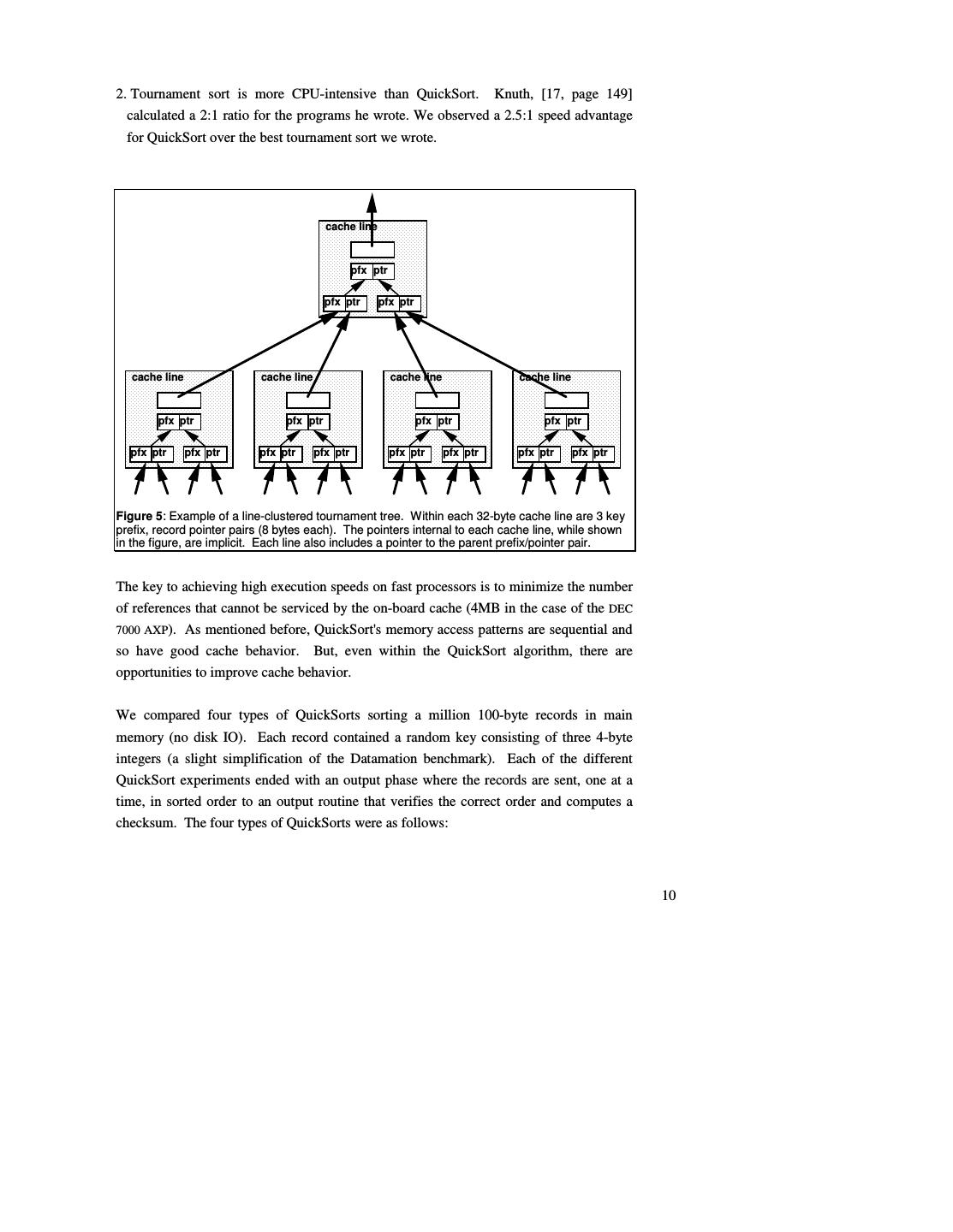 10 .2. Tournament sort is more CPU-intensive than QuickSort. Knuth, [17, page 149] calculated a 2:1 ratio for the programs he wrote. We observed a 2.5:1 speed advantage for QuickSort over the best tournament sort we wrote. cache line pfx ptr pfx ptr pfx ptr cache line cache line cache line cache line pfx ptr pfx ptr pfx ptr pfx ptr pfx ptr pfx ptr pfx ptr pfx ptr pfx ptr pfx ptr pfx ptr pfx ptr Figure 5: Example of a line-clustered tournament tree. Within each 32-byte cache line are 3 key prefix, record pointer pairs (8 bytes each). The pointers internal to each cache line, while shown in the figure, are implicit. Each line also includes a pointer to the parent prefix/pointer pair. The key to achieving high execution speeds on fast processors is to minimize the number of references that cannot be serviced by the on-board cache (4MB in the case of the DEC 7000 AXP). As mentioned before, QuickSort's memory access patterns are sequential and so have good cache behavior. But, even within the QuickSort algorithm, there are opportunities to improve cache behavior. We compared four types of QuickSorts sorting a million 100-byte records in main memory (no disk IO). Each record contained a random key consisting of three 4-byte integers (a slight simplification of the Datamation benchmark). Each of the different QuickSort experiments ended with an output phase where the records are sent, one at a time, in sorted order to an output routine that verifies the correct order and computes a checksum. The four types of QuickSorts were as follows: 10