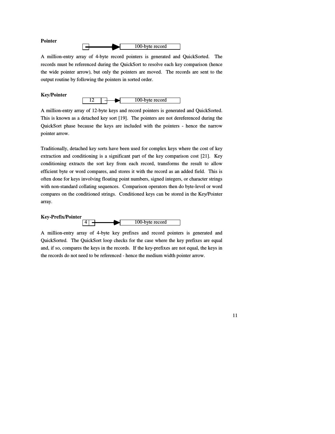 11 .Pointer 100-byte record A million-entry array of 4-byte record pointers is generated and QuickSorted. The records must be referenced during the QuickSort to resolve each key comparison (hence the wide pointer arrow), but only the pointers are moved. The records are sent to the output routine by following the pointers in sorted order. Key/Pointer 12 100-byte record A million-entry array of 12-byte keys and record pointers is generated and QuickSorted. This is known as a detached key sort [19]. The pointers are not dereferenced during the QuickSort phase because the keys are included with the pointers - hence the narrow pointer arrow. Traditionally, detached key sorts have been used for complex keys where the cost of key extraction and conditioning is a significant part of the key comparison cost [21]. Key conditioning extracts the sort key from each record, transforms the result to allow efficient byte or word compares, and stores it with the record as an added field. This is often done for keys involving floating point numbers, signed integers, or character strings with non-standard collating sequences. Comparison operators then do byte-level or word compares on the conditioned strings. Conditioned keys can be stored in the Key/Pointer array. Key-Prefix/Pointer 4 100-byte record A million-entry array of 4-byte key prefixes and record pointers is generated and QuickSorted. The QuickSort loop checks for the case where the key prefixes are equal and, if so, compares the keys in the records. If the key-prefixes are not equal, the keys in the records do not need to be referenced - hence the medium width pointer arrow. 11