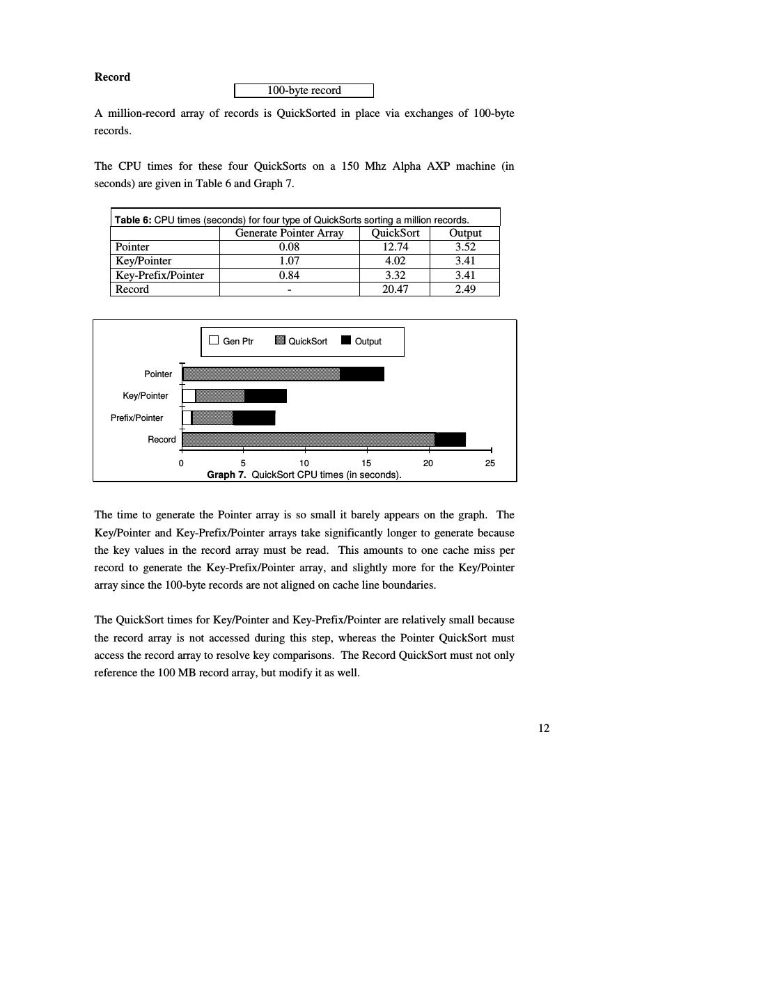 12 .Record 100-byte record A million-record array of records is QuickSorted in place via exchanges of 100-byte records. The CPU times for these four QuickSorts on a 150 Mhz Alpha AXP machine (in seconds) are given in Table 6 and Graph 7. Table 6: CPU times (seconds) for four type of QuickSorts sorting a million records. Generate Pointer Array QuickSort Output Pointer 0.08 12.74 3.52 Key/Pointer 1.07 4.02 3.41 Key-Prefix/Pointer 0.84 3.32 3.41 Record - 20.47 2.49 Gen Ptr QuickSort Output Pointer Key/Pointer Prefix/Pointer Record 0 5 10 15 20 25 Graph 7. QuickSort CPU times (in seconds). The time to generate the Pointer array is so small it barely appears on the graph. The Key/Pointer and Key-Prefix/Pointer arrays take significantly longer to generate because the key values in the record array must be read. This amounts to one cache miss per record to generate the Key-Prefix/Pointer array, and slightly more for the Key/Pointer array since the 100-byte records are not aligned on cache line boundaries. The QuickSort times for Key/Pointer and Key-Prefix/Pointer are relatively small because the record array is not accessed during this step, whereas the Pointer QuickSort must access the record array to resolve key comparisons. The Record QuickSort must not only reference the 100 MB record array, but modify it as well. 12