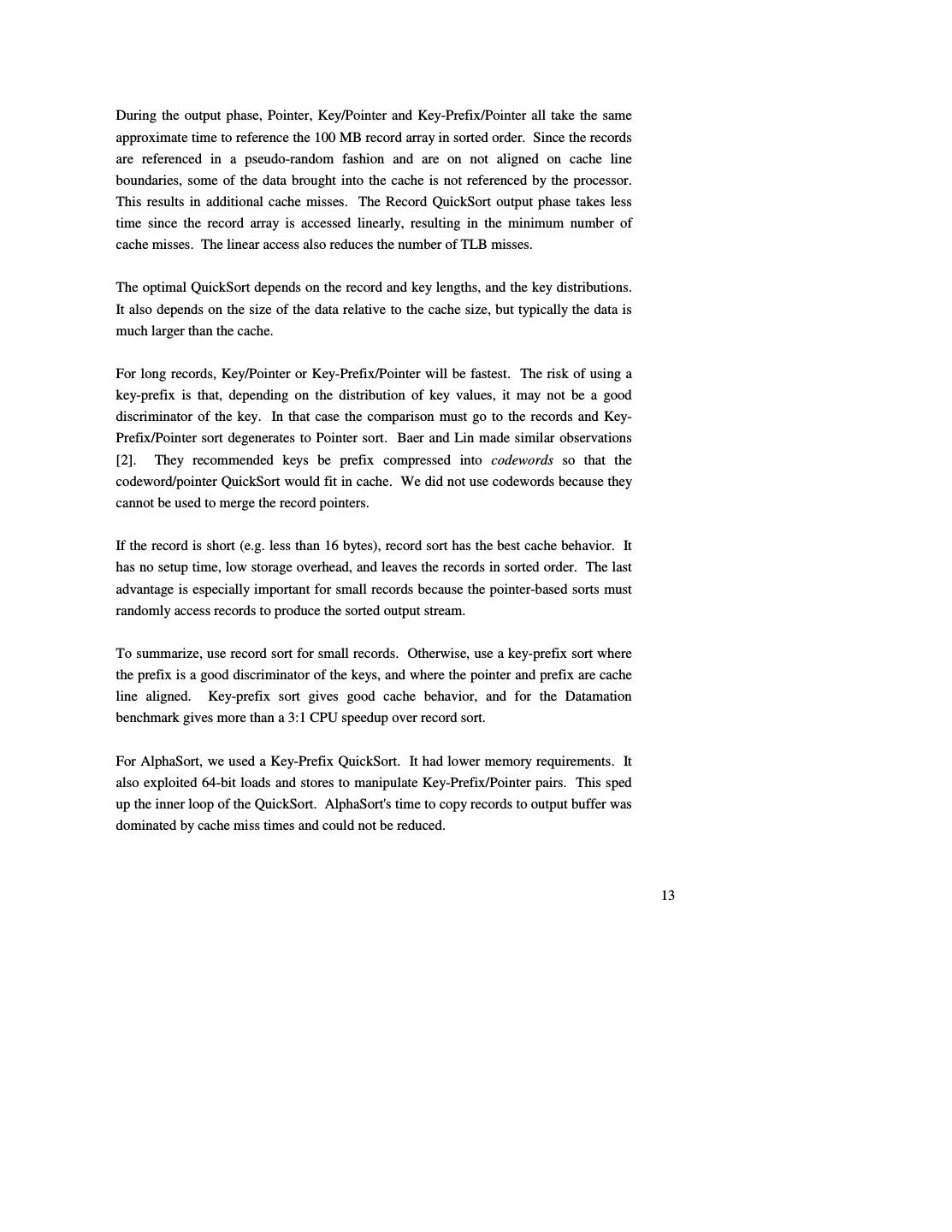13 .During the output phase, Pointer, Key/Pointer and Key-Prefix/Pointer all take the same approximate time to reference the 100 MB record array in sorted order. Since the records are referenced in a pseudo-random fashion and are on not aligned on cache line boundaries, some of the data brought into the cache is not referenced by the processor. This results in additional cache misses. The Record QuickSort output phase takes less time since the record array is accessed linearly, resulting in the minimum number of cache misses. The linear access also reduces the number of TLB misses. The optimal QuickSort depends on the record and key lengths, and the key distributions. It also depends on the size of the data relative to the cache size, but typically the data is much larger than the cache. For long records, Key/Pointer or Key-Prefix/Pointer will be fastest. The risk of using a key-prefix is that, depending on the distribution of key values, it may not be a good discriminator of the key. In that case the comparison must go to the records and Key- Prefix/Pointer sort degenerates to Pointer sort. Baer and Lin made similar observations [2]. They recommended keys be prefix compressed into codewords so that the codeword/pointer QuickSort would fit in cache. We did not use codewords because they cannot be used to merge the record pointers. If the record is short (e.g. less than 16 bytes), record sort has the best cache behavior. It has no setup time, low storage overhead, and leaves the records in sorted order. The last advantage is especially important for small records because the pointer-based sorts must randomly access records to produce the sorted output stream. To summarize, use record sort for small records. Otherwise, use a key-prefix sort where the prefix is a good discriminator of the keys, and where the pointer and prefix are cache line aligned. Key-prefix sort gives good cache behavior, and for the Datamation benchmark gives more than a 3:1 CPU speedup over record sort. For AlphaSort, we used a Key-Prefix QuickSort. It had lower memory requirements. It also exploited 64-bit loads and stores to manipulate Key-Prefix/Pointer pairs. This sped up the inner loop of the QuickSort. AlphaSort's time to copy records to output buffer was dominated by cache miss times and could not be reduced. 13
