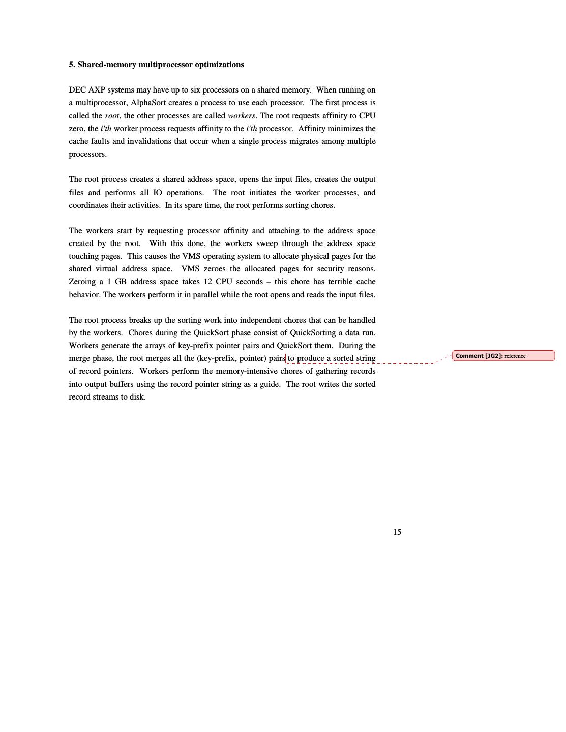 15 .5. Shared-memory multiprocessor optimizations DEC AXP systems may have up to six processors on a shared memory. When running on a multiprocessor, AlphaSort creates a process to use each processor. The first process is called the root, the other processes are called workers. The root requests affinity to CPU zero, the i'th worker process requests affinity to the i'th processor. Affinity minimizes the cache faults and invalidations that occur when a single process migrates among multiple processors. The root process creates a shared address space, opens the input files, creates the output files and performs all IO operations. The root initiates the worker processes, and coordinates their activities. In its spare time, the root performs sorting chores. The workers start by requesting processor affinity and attaching to the address space created by the root. With this done, the workers sweep through the address space touching pages. This causes the VMS operating system to allocate physical pages for the shared virtual address space. VMS zeroes the allocated pages for security reasons. Zeroing a 1 GB address space takes 12 CPU seconds – this chore has terrible cache behavior. The workers perform it in parallel while the root opens and reads the input files. The root process breaks up the sorting work into independent chores that can be handled by the workers. Chores during the QuickSort phase consist of QuickSorting a data run. Workers generate the arrays of key-prefix pointer pairs and QuickSort them. During the reference merge phase, the root merges all the (key-prefix, pointer) pairs to produce a sorted string of record pointers. Workers perform the memory-intensive chores of gathering records into output buffers using the record pointer string as a guide. The root writes the sorted record streams to disk. 15