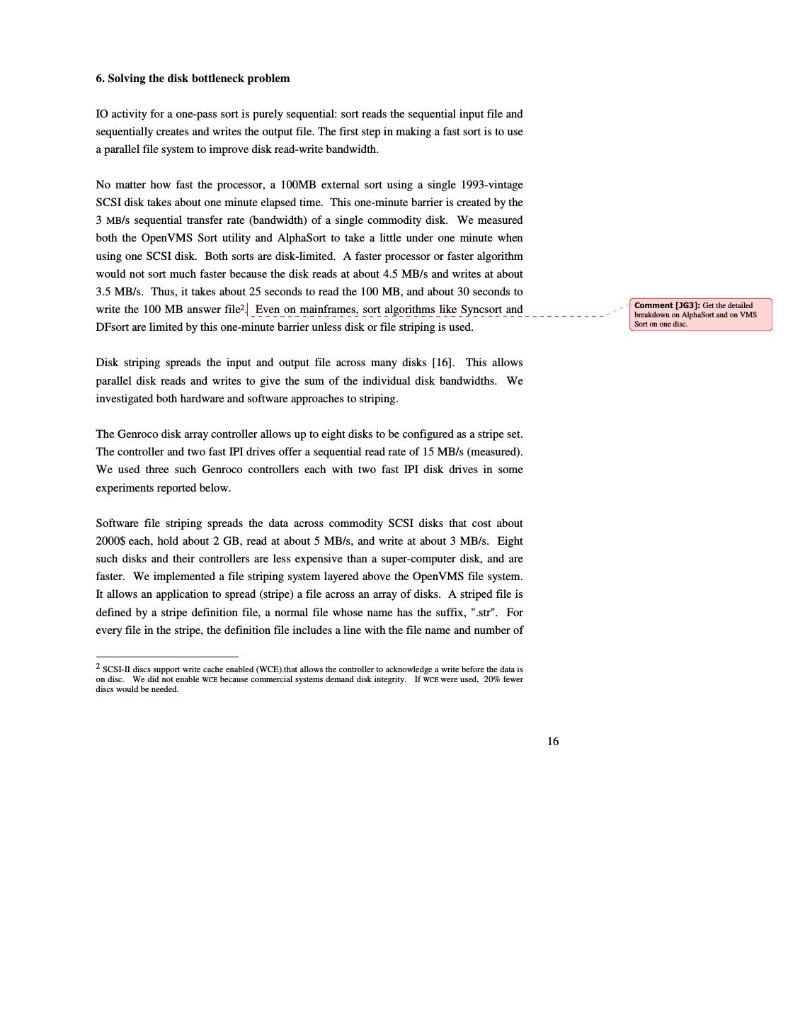 16 .6. Solving the disk bottleneck problem IO activity for a one-pass sort is purely sequential: sort reads the sequential input file and sequentially creates and writes the output file. The first step in making a fast sort is to use a parallel file system to improve disk read-write bandwidth. No matter how fast the processor, a 100MB external sort using a single 1993-vintage SCSI disk takes about one minute elapsed time. This one-minute barrier is created by the 3 MB/s sequential transfer rate (bandwidth) of a single commodity disk. We measured both the OpenVMS Sort utility and AlphaSort to take a little under one minute when using one SCSI disk. Both sorts are disk-limited. A faster processor or faster algorithm would not sort much faster because the disk reads at about 4.5 MB/s and writes at about 3.5 MB/s. Thus, it takes about 25 seconds to read the 100 MB, and about 30 seconds to Get the detailed write the 100 MB answer file2. Even on mainframes, sort algorithms like Syncsort and breakdown on AlphaSort and on VMS Sort on one disc. DFsort are limited by this one-minute barrier unless disk or file striping is used. Disk striping spreads the input and output file across many disks [16]. This allows parallel disk reads and writes to give the sum of the individual disk bandwidths. We investigated both hardware and software approaches to striping. The Genroco disk array controller allows up to eight disks to be configured as a stripe set. The controller and two fast IPI drives offer a sequential read rate of 15 MB/s (measured). We used three such Genroco controllers each with two fast IPI disk drives in some experiments reported below. Software file striping spreads the data across commodity SCSI disks that cost about 2000$ each, hold about 2 GB, read at about 5 MB/s, and write at about 3 MB/s. Eight such disks and their controllers are less expensive than a super-computer disk, and are faster. We implemented a file striping system layered above the OpenVMS file system. It allows an application to spread (stripe) a file across an array of disks. A striped file is defined by a stripe definition file, a normal file whose name has the suffix, ".str". For every file in the stripe, the definition file includes a line with the file name and number of 2 SCSI-II discs support write cache enabled (WCE).that allows the controller to acknowledge a write before the data is on disc. We did not enable WCE because commercial systems demand disk integrity. If WCE were used, 20% fewer discs would be needed. 16