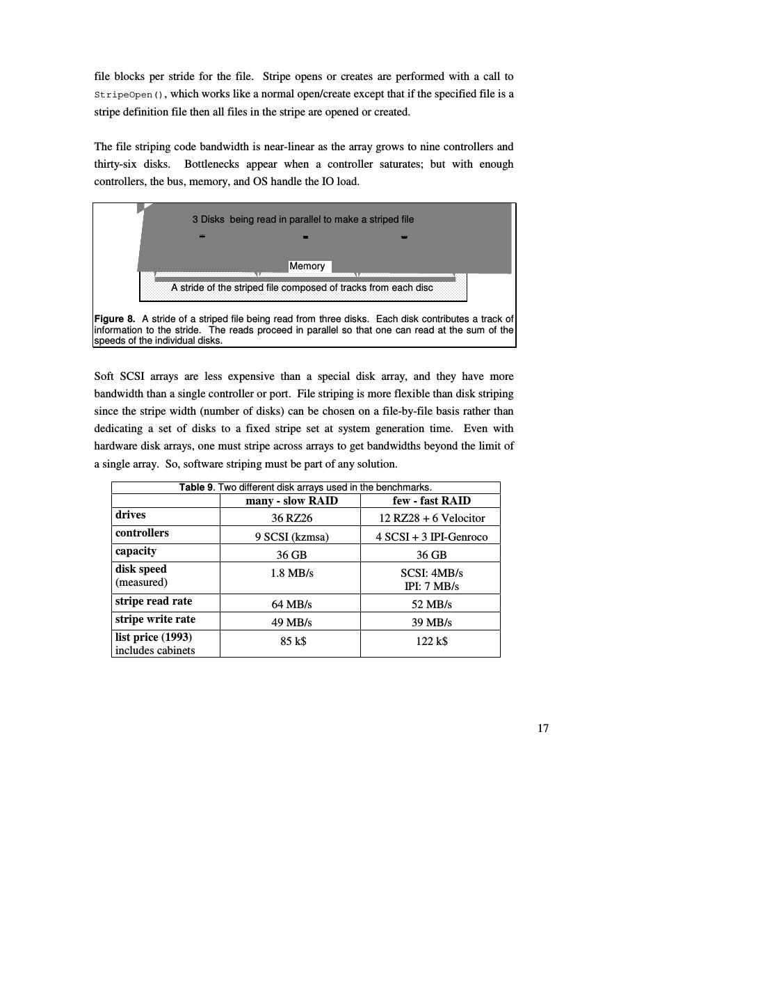 17 .file blocks per stride for the file. Stripe opens or creates are performed with a call to StripeOpen(), which works like a normal open/create except that if the specified file is a stripe definition file then all files in the stripe are opened or created. The file striping code bandwidth is near-linear as the array grows to nine controllers and thirty-six disks. Bottlenecks appear when a controller saturates; but with enough controllers, the bus, memory, and OS handle the IO load. 3 Disks being read in parallel to make a striped file Memory A stride of the striped file composed of tracks from each disc Figure 8. A stride of a striped file being read from three disks. Each disk contributes a track of information to the stride. The reads proceed in parallel so that one can read at the sum of the speeds of the individual disks. Soft SCSI arrays are less expensive than a special disk array, and they have more bandwidth than a single controller or port. File striping is more flexible than disk striping since the stripe width (number of disks) can be chosen on a file-by-file basis rather than dedicating a set of disks to a fixed stripe set at system generation time. Even with hardware disk arrays, one must stripe across arrays to get bandwidths beyond the limit of a single array. So, software striping must be part of any solution. Table 9. Two different disk arrays used in the benchmarks. many - slow RAID few - fast RAID drives 36 RZ26 12 RZ28 + 6 Velocitor controllers 9 SCSI (kzmsa) 4 SCSI + 3 IPI-Genroco capacity 36 GB 36 GB disk speed 1.8 MB/s SCSI: 4MB/s (measured) IPI: 7 MB/s stripe read rate 64 MB/s 52 MB/s stripe write rate 49 MB/s 39 MB/s list price (1993) 85 k$ 122 k$ includes cabinets 17