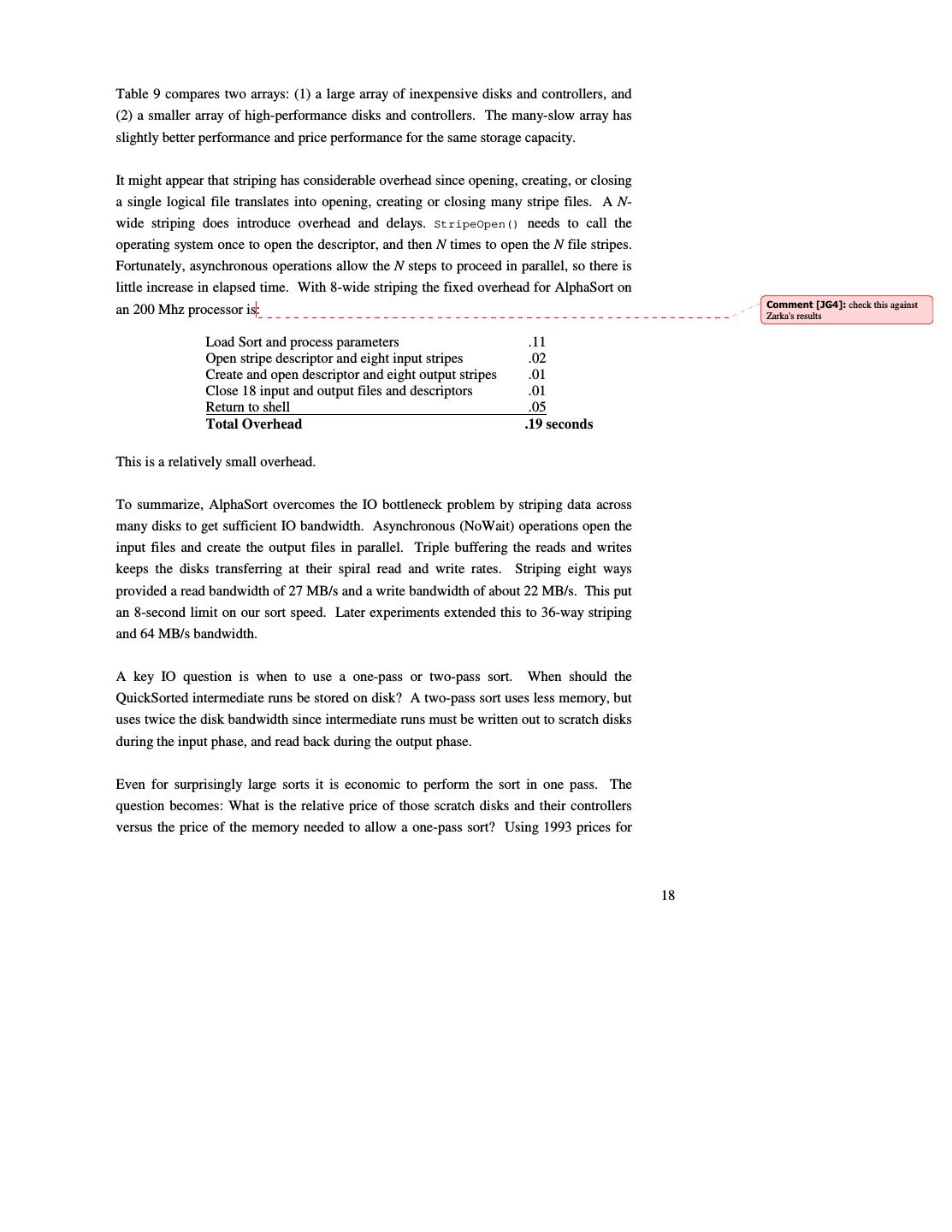 18 .Table 9 compares two arrays: (1) a large array of inexpensive disks and controllers, and (2) a smaller array of high-performance disks and controllers. The many-slow array has slightly better performance and price performance for the same storage capacity. It might appear that striping has considerable overhead since opening, creating, or closing a single logical file translates into opening, creating or closing many stripe files. A N- wide striping does introduce overhead and delays. StripeOpen() needs to call the operating system once to open the descriptor, and then N times to open the N file stripes. Fortunately, asynchronous operations allow the N steps to proceed in parallel, so there is little increase in elapsed time. With 8-wide striping the fixed overhead for AlphaSort on check this against an 200 Mhz processor is: Zarka's results Load Sort and process parameters .11 Open stripe descriptor and eight input stripes .02 Create and open descriptor and eight output stripes .01 Close 18 input and output files and descriptors .01 Return to shell .05 Total Overhead .19 seconds This is a relatively small overhead. To summarize, AlphaSort overcomes the IO bottleneck problem by striping data across many disks to get sufficient IO bandwidth. Asynchronous (NoWait) operations open the input files and create the output files in parallel. Triple buffering the reads and writes keeps the disks transferring at their spiral read and write rates. Striping eight ways provided a read bandwidth of 27 MB/s and a write bandwidth of about 22 MB/s. This put an 8-second limit on our sort speed. Later experiments extended this to 36-way striping and 64 MB/s bandwidth. A key IO question is when to use a one-pass or two-pass sort. When should the QuickSorted intermediate runs be stored on disk? A two-pass sort uses less memory, but uses twice the disk bandwidth since intermediate runs must be written out to scratch disks during the input phase, and read back during the output phase. Even for surprisingly large sorts it is economic to perform the sort in one pass. The question becomes: What is the relative price of those scratch disks and their controllers versus the price of the memory needed to allow a one-pass sort? Using 1993 prices for 18