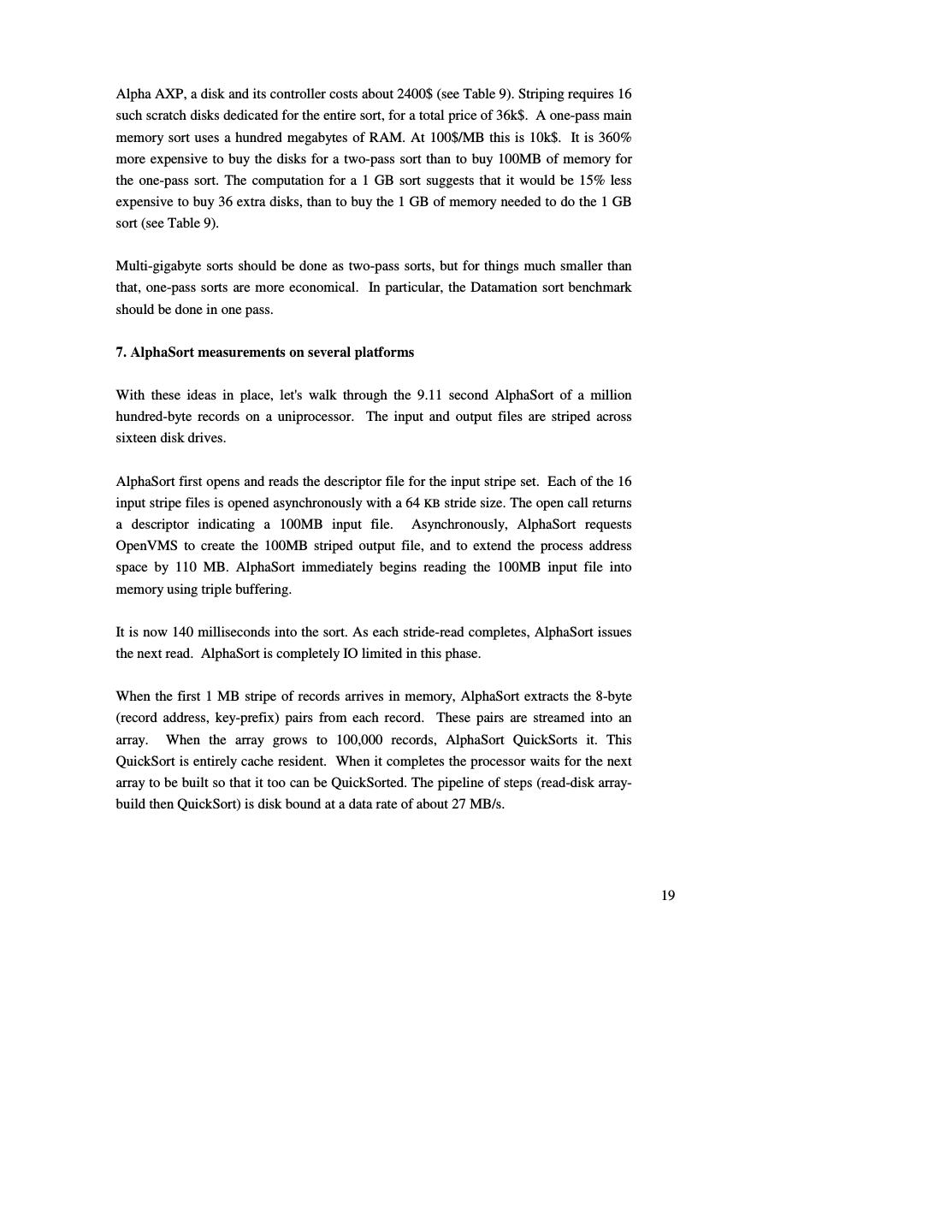 19 .Alpha AXP, a disk and its controller costs about 2400$ (see Table 9). Striping requires 16 such scratch disks dedicated for the entire sort, for a total price of 36k$. A one-pass main memory sort uses a hundred megabytes of RAM. At 100$/MB this is 10k$. It is 360% more expensive to buy the disks for a two-pass sort than to buy 100MB of memory for the one-pass sort. The computation for a 1 GB sort suggests that it would be 15% less expensive to buy 36 extra disks, than to buy the 1 GB of memory needed to do the 1 GB sort (see Table 9). Multi-gigabyte sorts should be done as two-pass sorts, but for things much smaller than that, one-pass sorts are more economical. In particular, the Datamation sort benchmark should be done in one pass. 7. AlphaSort measurements on several platforms With these ideas in place, let's walk through the 9.11 second AlphaSort of a million hundred-byte records on a uniprocessor. The input and output files are striped across sixteen disk drives. AlphaSort first opens and reads the descriptor file for the input stripe set. Each of the 16 input stripe files is opened asynchronously with a 64 KB stride size. The open call returns a descriptor indicating a 100MB input file. Asynchronously, AlphaSort requests OpenVMS to create the 100MB striped output file, and to extend the process address space by 110 MB. AlphaSort immediately begins reading the 100MB input file into memory using triple buffering. It is now 140 milliseconds into the sort. As each stride-read completes, AlphaSort issues the next read. AlphaSort is completely IO limited in this phase. When the first 1 MB stripe of records arrives in memory, AlphaSort extracts the 8-byte (record address, key-prefix) pairs from each record. These pairs are streamed into an array. When the array grows to 100,000 records, AlphaSort QuickSorts it. This QuickSort is entirely cache resident. When it completes the processor waits for the next array to be built so that it too can be QuickSorted. The pipeline of steps (read-disk array- build then QuickSort) is disk bound at a data rate of about 27 MB/s. 19