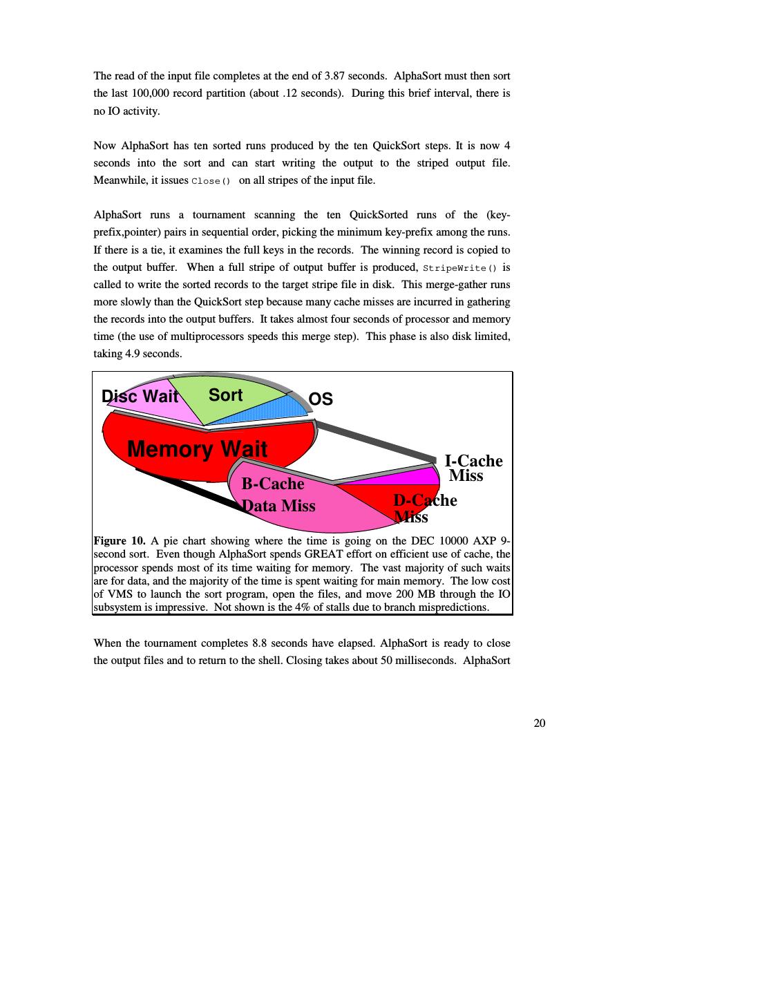 20 .The read of the input file completes at the end of 3.87 seconds. AlphaSort must then sort the last 100,000 record partition (about .12 seconds). During this brief interval, there is no IO activity. Now AlphaSort has ten sorted runs produced by the ten QuickSort steps. It is now 4 seconds into the sort and can start writing the output to the striped output file. Meanwhile, it issues Close() on all stripes of the input file. AlphaSort runs a tournament scanning the ten QuickSorted runs of the (key- prefix,pointer) pairs in sequential order, picking the minimum key-prefix among the runs. If there is a tie, it examines the full keys in the records. The winning record is copied to the output buffer. When a full stripe of output buffer is produced, StripeWrite() is called to write the sorted records to the target stripe file in disk. This merge-gather runs more slowly than the QuickSort step because many cache misses are incurred in gathering the records into the output buffers. It takes almost four seconds of processor and memory time (the use of multiprocessors speeds this merge step). This phase is also disk limited, taking 4.9 seconds. Disc Wait Disc Wait Sort Sort OS Memory Wait I-Cache B-Cache Miss Data Miss D-Cache Miss Figure 10. A pie chart showing where the time is going on the DEC 10000 AXP 9- second sort. Even though AlphaSort spends GREAT effort on efficient use of cache, the processor spends most of its time waiting for memory. The vast majority of such waits are for data, and the majority of the time is spent waiting for main memory. The low cost of VMS to launch the sort program, open the files, and move 200 MB through the IO subsystem is impressive. Not shown is the 4% of stalls due to branch mispredictions. When the tournament completes 8.8 seconds have elapsed. AlphaSort is ready to close the output files and to return to the shell. Closing takes about 50 milliseconds. AlphaSort 20