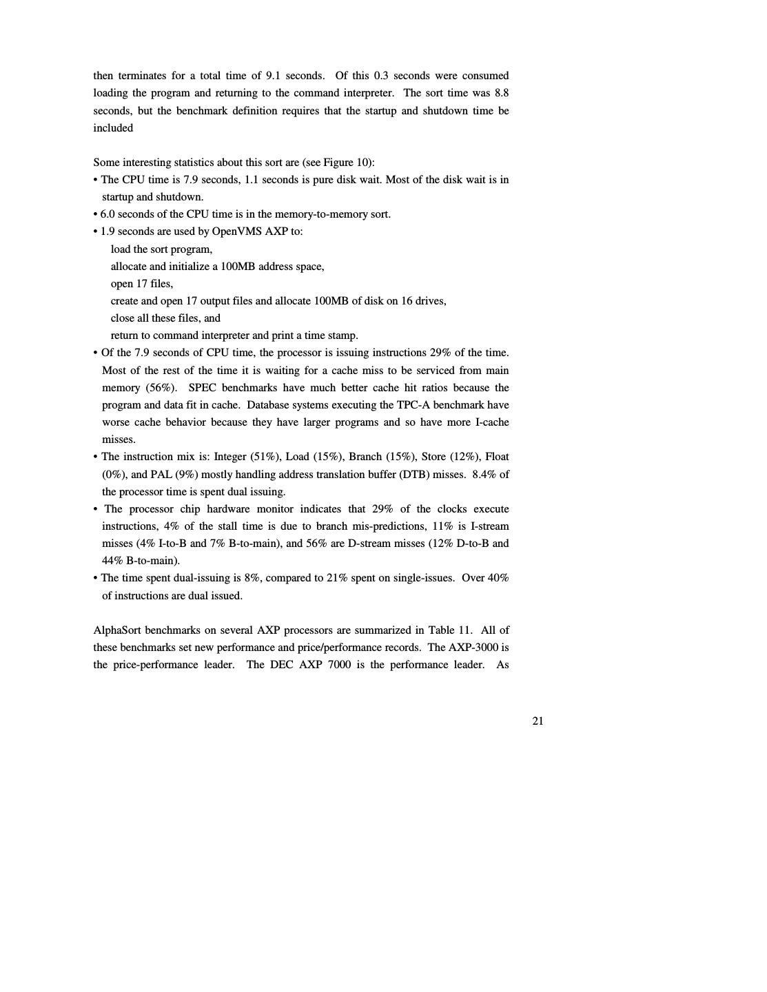 21 .then terminates for a total time of 9.1 seconds. Of this 0.3 seconds were consumed loading the program and returning to the command interpreter. The sort time was 8.8 seconds, but the benchmark definition requires that the startup and shutdown time be included Some interesting statistics about this sort are (see Figure 10): • The CPU time is 7.9 seconds, 1.1 seconds is pure disk wait. Most of the disk wait is in startup and shutdown. • 6.0 seconds of the CPU time is in the memory-to-memory sort. • 1.9 seconds are used by OpenVMS AXP to: load the sort program, allocate and initialize a 100MB address space, open 17 files, create and open 17 output files and allocate 100MB of disk on 16 drives, close all these files, and return to command interpreter and print a time stamp. • Of the 7.9 seconds of CPU time, the processor is issuing instructions 29% of the time. Most of the rest of the time it is waiting for a cache miss to be serviced from main memory (56%). SPEC benchmarks have much better cache hit ratios because the program and data fit in cache. Database systems executing the TPC-A benchmark have worse cache behavior because they have larger programs and so have more I-cache misses. • The instruction mix is: Integer (51%), Load (15%), Branch (15%), Store (12%), Float (0%), and PAL (9%) mostly handling address translation buffer (DTB) misses. 8.4% of the processor time is spent dual issuing. • The processor chip hardware monitor indicates that 29% of the clocks execute instructions, 4% of the stall time is due to branch mis-predictions, 11% is I-stream misses (4% I-to-B and 7% B-to-main), and 56% are D-stream misses (12% D-to-B and 44% B-to-main). • The time spent dual-issuing is 8%, compared to 21% spent on single-issues. Over 40% of instructions are dual issued. AlphaSort benchmarks on several AXP processors are summarized in Table 11. All of these benchmarks set new performance and price/performance records. The AXP-3000 is the price-performance leader. The DEC AXP 7000 is the performance leader. As 21