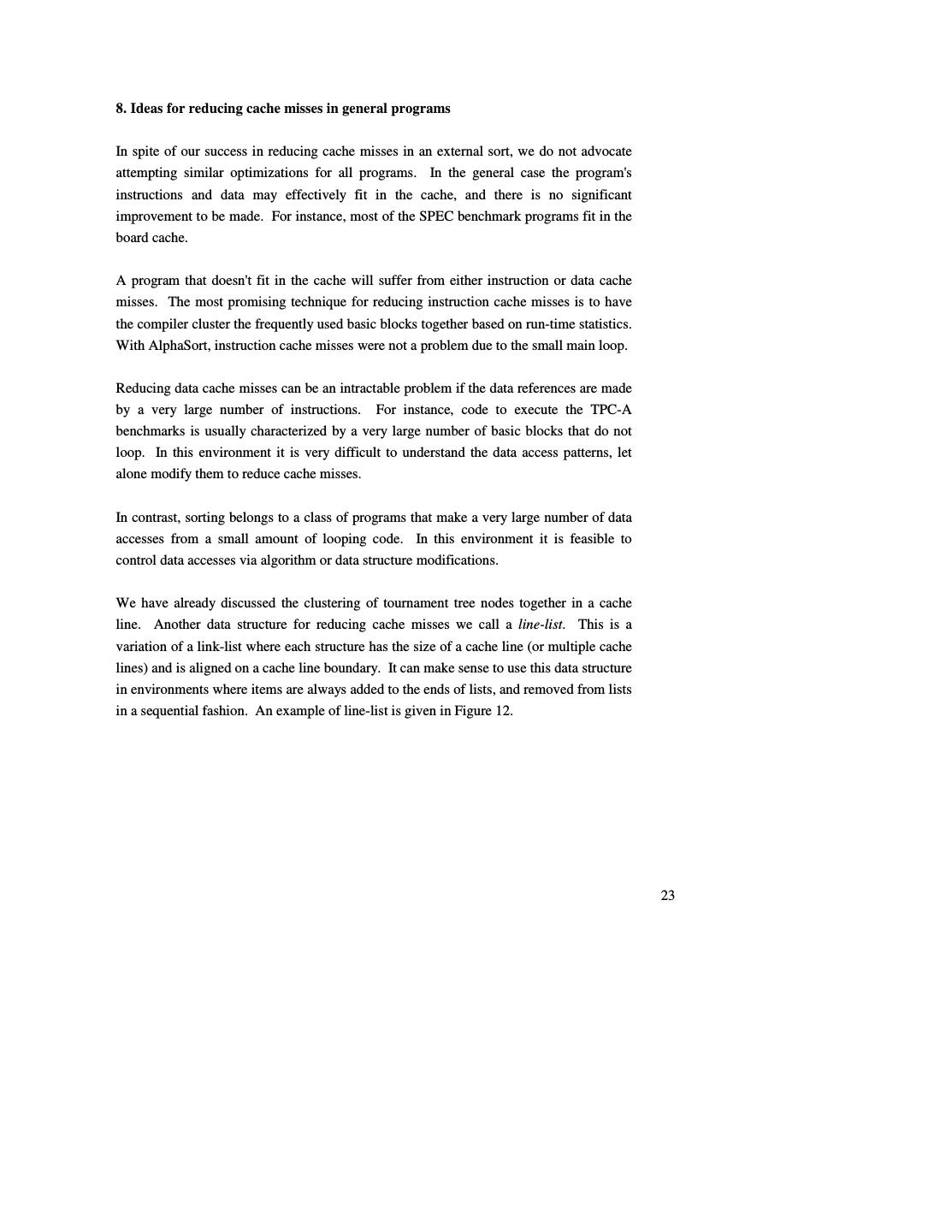 23 .8. Ideas for reducing cache misses in general programs In spite of our success in reducing cache misses in an external sort, we do not advocate attempting similar optimizations for all programs. In the general case the program's instructions and data may effectively fit in the cache, and there is no significant improvement to be made. For instance, most of the SPEC benchmark programs fit in the board cache. A program that doesn't fit in the cache will suffer from either instruction or data cache misses. The most promising technique for reducing instruction cache misses is to have the compiler cluster the frequently used basic blocks together based on run-time statistics. With AlphaSort, instruction cache misses were not a problem due to the small main loop. Reducing data cache misses can be an intractable problem if the data references are made by a very large number of instructions. For instance, code to execute the TPC-A benchmarks is usually characterized by a very large number of basic blocks that do not loop. In this environment it is very difficult to understand the data access patterns, let alone modify them to reduce cache misses. In contrast, sorting belongs to a class of programs that make a very large number of data accesses from a small amount of looping code. In this environment it is feasible to control data accesses via algorithm or data structure modifications. We have already discussed the clustering of tournament tree nodes together in a cache line. Another data structure for reducing cache misses we call a line-list. This is a variation of a link-list where each structure has the size of a cache line (or multiple cache lines) and is aligned on a cache line boundary. It can make sense to use this data structure in environments where items are always added to the ends of lists, and removed from lists in a sequential fashion. An example of line-list is given in Figure 12. 23