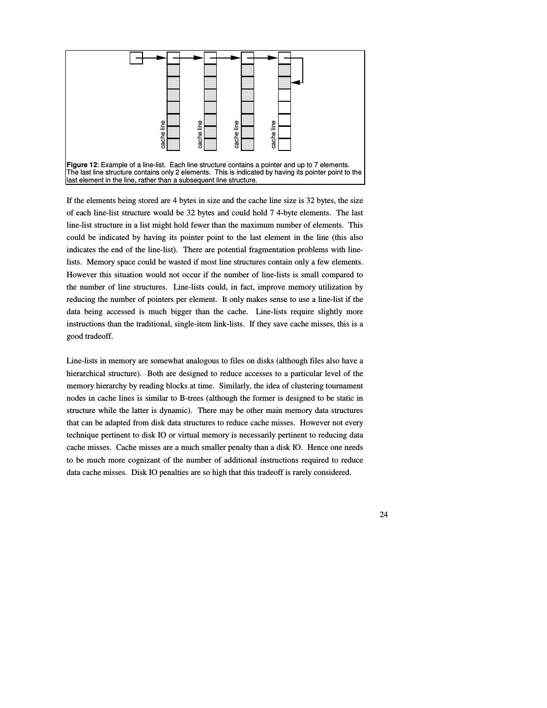 24 . cache line cache line cache line cache line Figure 12: Example of a line-list. Each line structure contains a pointer and up to 7 elements. The last line structure contains only 2 elements. This is indicated by having its pointer point to the last element in the line, rather than a subsequent line structure. If the elements being stored are 4 bytes in size and the cache line size is 32 bytes, the size of each line-list structure would be 32 bytes and could hold 7 4-byte elements. The last line-list structure in a list might hold fewer than the maximum number of elements. This could be indicated by having its pointer point to the last element in the line (this also indicates the end of the line-list). There are potential fragmentation problems with line- lists. Memory space could be wasted if most line structures contain only a few elements. However this situation would not occur if the number of line-lists is small compared to the number of line structures. Line-lists could, in fact, improve memory utilization by reducing the number of pointers per element. It only makes sense to use a line-list if the data being accessed is much bigger than the cache. Line-lists require slightly more instructions than the traditional, single-item link-lists. If they save cache misses, this is a good tradeoff. Line-lists in memory are somewhat analogous to files on disks (although files also have a hierarchical structure). Both are designed to reduce accesses to a particular level of the memory hierarchy by reading blocks at time. Similarly, the idea of clustering tournament nodes in cache lines is similar to B-trees (although the former is designed to be static in structure while the latter is dynamic). There may be other main memory data structures that can be adapted from disk data structures to reduce cache misses. However not every technique pertinent to disk IO or virtual memory is necessarily pertinent to reducing data cache misses. Cache misses are a much smaller penalty than a disk IO. Hence one needs to be much more cognizant of the number of additional instructions required to reduce data cache misses. Disk IO penalties are so high that this tradeoff is rarely considered. 24
