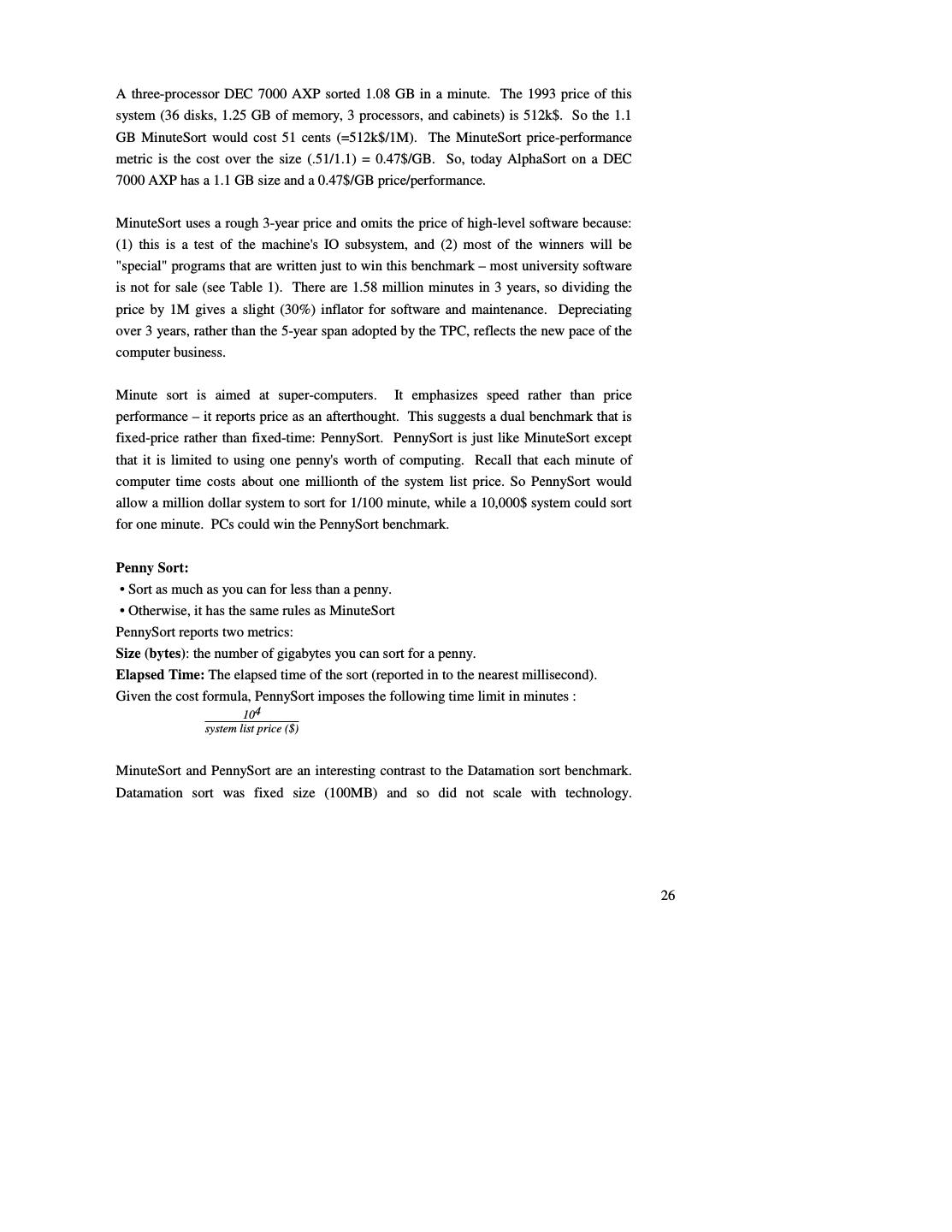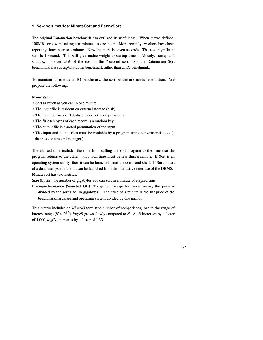 25 .9. New sort metrics: MinuteSort and PennySort The original Datamation benchmark has outlived its usefulness. When it was defined, 100MB sorts were taking ten minutes to one hour. More recently, workers have been reporting times near one minute. Now the mark is seven seconds. The next significant step is 1 second. This will give undue weight to startup times. Already, startup and shutdown is over 25% of the cost of the 7-second sort. So, the Datamation Sort benchmark is a startup/shutdown benchmark rather than an IO benchmark. To maintain its role as an IO benchmark, the sort benchmark needs redefinition. We propose the following: MinuteSort: • Sort as much as you can in one minute. • The input file is resident on external storage (disk). • The input consists of 100-byte records (incompressible). • The first ten bytes of each record is a random key. • The output file is a sorted permutation of the input. • The input and output files must be readable by a program using conventional tools (a database or a record manager.) The elapsed time includes the time from calling the sort program to the time that the program returns to the caller – this total time must be less than a minute. If Sort is an operating system utility, then it can be launched from the command shell. If Sort is part of a database system, then it can be launched from the interactive interface of the DBMS. MinuteSort has two metrics: Size (bytes): the number of gigabytes you can sort in a minute of elapsed time Price-performance ($/sorted GB): To get a price-performance metric, the price is divided by the sort size (in gigabytes). The price of a minute is the list price of the benchmark hardware and operating system divided by one million. This metric includes an Nlog(N) term (the number of comparisons) but in the range of interest range (N > 230), log(N) grows slowly compared to N. As N increases by a factor of 1,000, log(N) increases by a factor of 1.33. 25