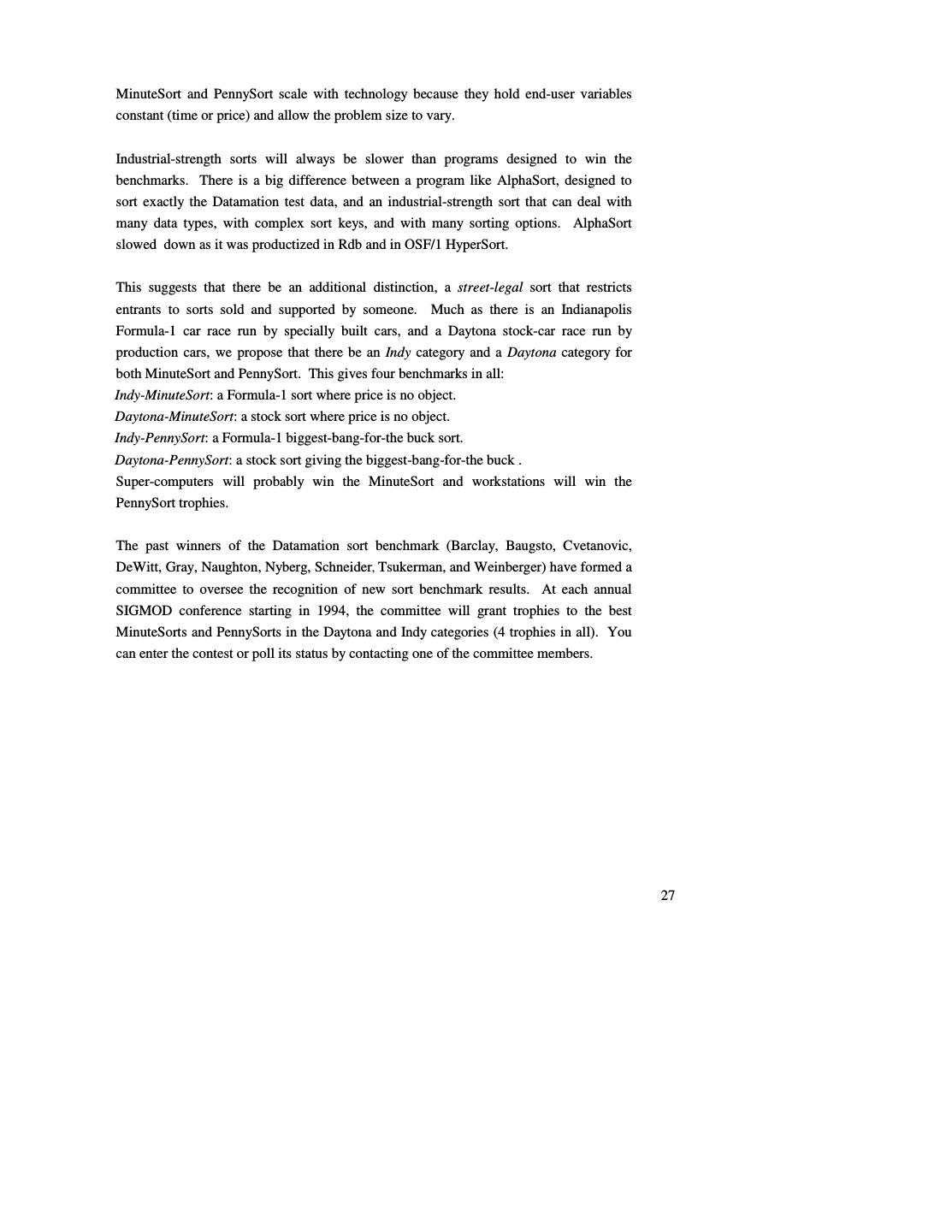 27 .MinuteSort and PennySort scale with technology because they hold end-user variables constant (time or price) and allow the problem size to vary. Industrial-strength sorts will always be slower than programs designed to win the benchmarks. There is a big difference between a program like AlphaSort, designed to sort exactly the Datamation test data, and an industrial-strength sort that can deal with many data types, with complex sort keys, and with many sorting options. AlphaSort slowed down as it was productized in Rdb and in OSF/1 HyperSort. This suggests that there be an additional distinction, a street-legal sort that restricts entrants to sorts sold and supported by someone. Much as there is an Indianapolis Formula-1 car race run by specially built cars, and a Daytona stock-car race run by production cars, we propose that there be an Indy category and a Daytona category for both MinuteSort and PennySort. This gives four benchmarks in all: Indy-MinuteSort: a Formula-1 sort where price is no object. Daytona-MinuteSort: a stock sort where price is no object. Indy-PennySort: a Formula-1 biggest-bang-for-the buck sort. Daytona-PennySort: a stock sort giving the biggest-bang-for-the buck . Super-computers will probably win the MinuteSort and workstations will win the PennySort trophies. The past winners of the Datamation sort benchmark (Barclay, Baugsto, Cvetanovic, DeWitt, Gray, Naughton, Nyberg, Schneider, Tsukerman, and Weinberger) have formed a committee to oversee the recognition of new sort benchmark results. At each annual SIGMOD conference starting in 1994, the committee will grant trophies to the best MinuteSorts and PennySorts in the Daytona and Indy categories (4 trophies in all). You can enter the contest or poll its status by contacting one of the committee members. 27