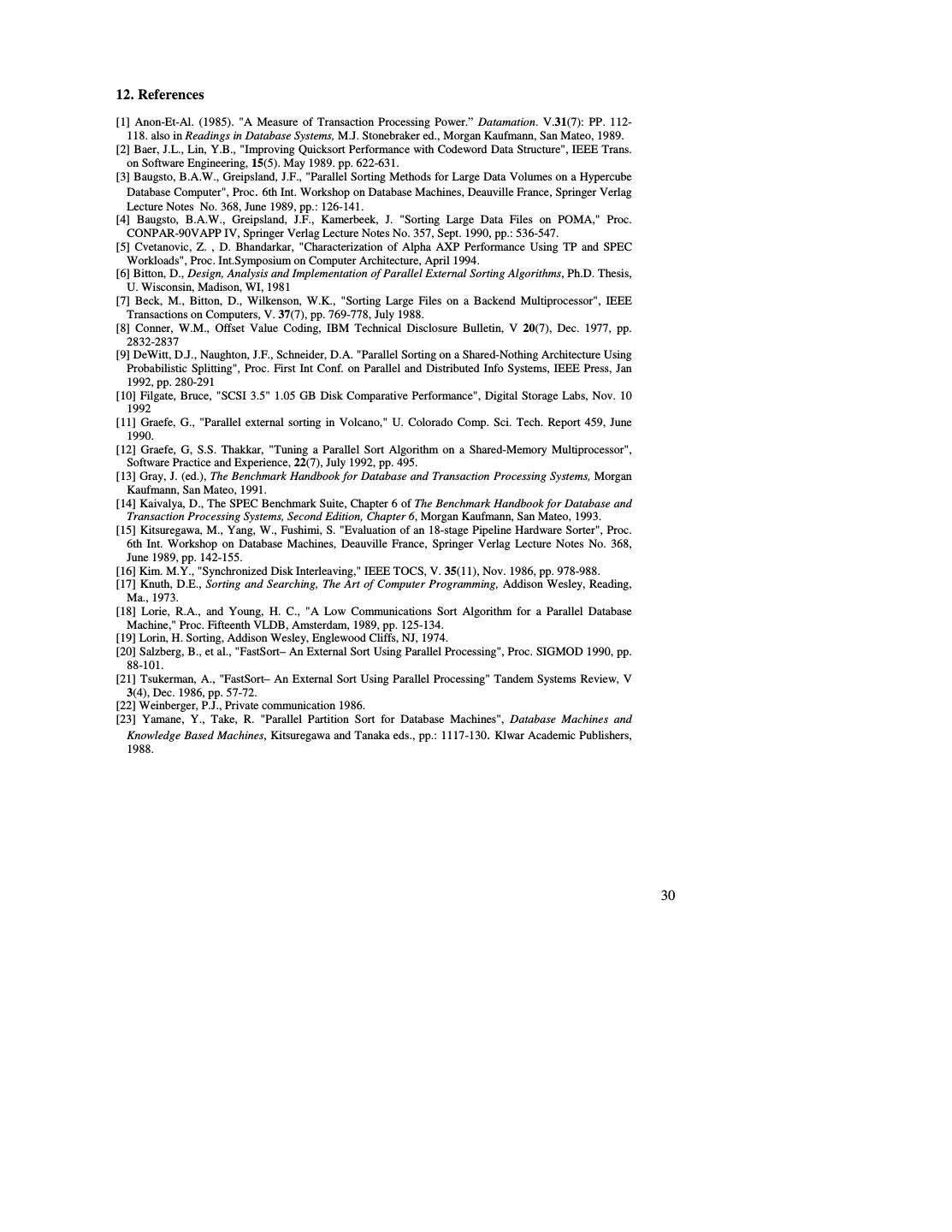 29 .11. Acknowledgments Al Avery encouraged us and helped us get access to equipment. Doug Hoeger gave us advice on OpenVMS sort. Ken Bates provided the source code of a file striping prototype he did five years ago. Dave Eiche, Ben Thomas, Rod Widdowson, and Drew Mason gave us good advice on the OpenVMS AXP IO system. Bill Noyce and Dick Sites gave us advice on AXP code sequences. Bruce Fillgate, Richie Lary, and Fred Vasconcellos gave us advice and help on disks and loaned us some RZ74 disks to do the tests. Steve Holmes and Paline Nist gave us access to systems in their labs and helped us borrow hardware. Gary Lidington and Scott Tincher helped get the excellent DEC 4000 AXP results. Joe Nordman of Genroco provided us with fast IPI disks and controllers for the DEC 4000 AXP tests. The referees for both versions of this paper gave us many valuable suggestions and comments. 29
