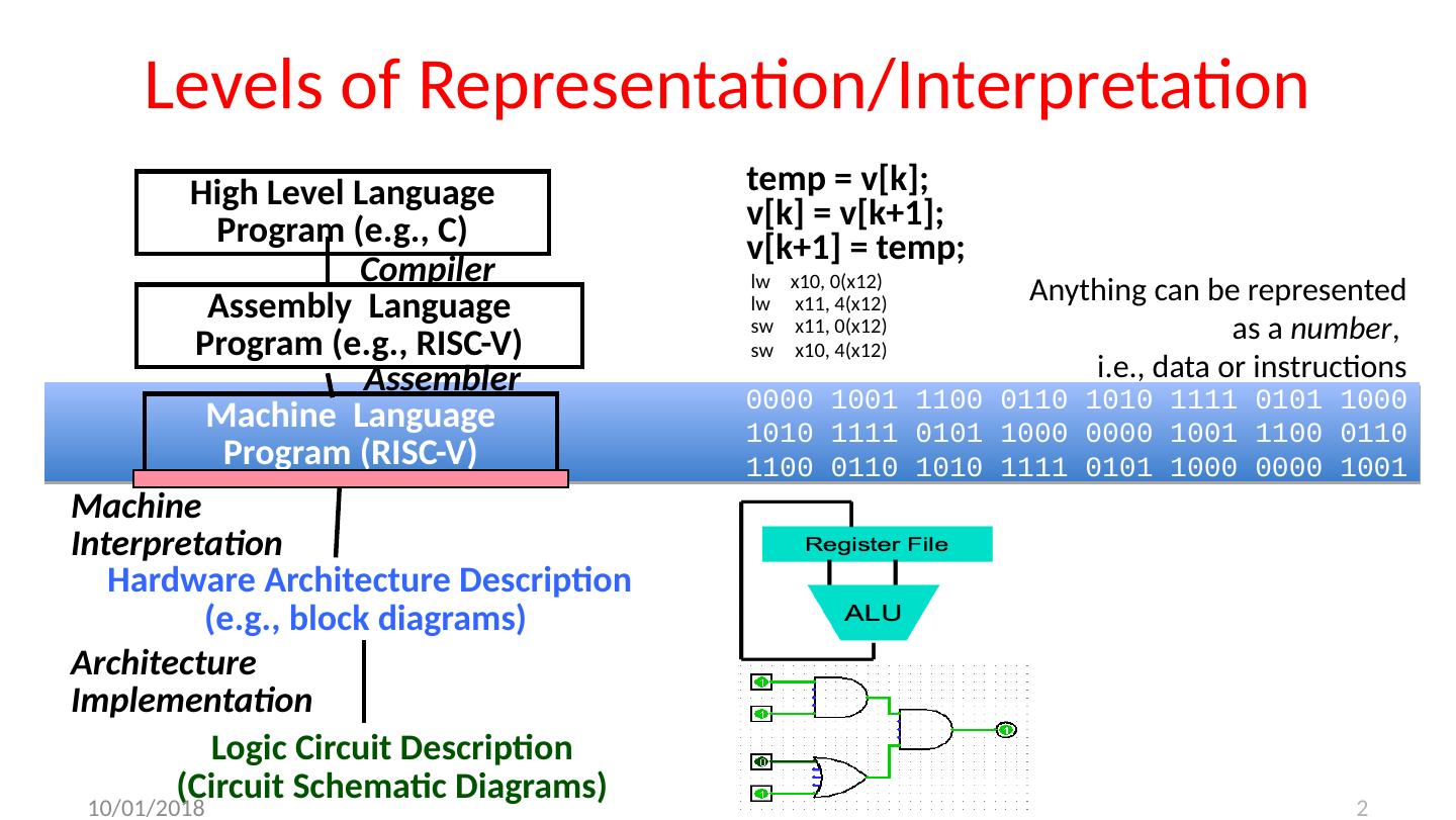 2 .Levels of Representation/Interpretation lw x10 , 0 (x12 ) lw x11 , 4 (x12 ) sw x11 , 0(x12 ) sw x10 , 4 (x12 ) High Level Language Program (e.g., C) Assembly Language Program ( e.g., RISC-V) Machine Language Program (RISC-V) Hardware Architecture Description ( e.g., block diagrams) Compiler Assembler Machine Interpretation temp = v[k ]; v[k ] = v[k+1]; v[k+1] = temp; 0000 1001 1100 0110 1010 1111 0101 1000 1010 1111 0101 1000 0000 1001 1100 0110 1100 0110 1010 1111 0101 1000 0000 1001 0101 1000 0000 1001 1100 0110 1010 1111 Architecture Implementation Anything can be represented as a number , i.e., data or instructions Logic Circuit Description (Circuit Schematic Diagrams) 9/14/17 2