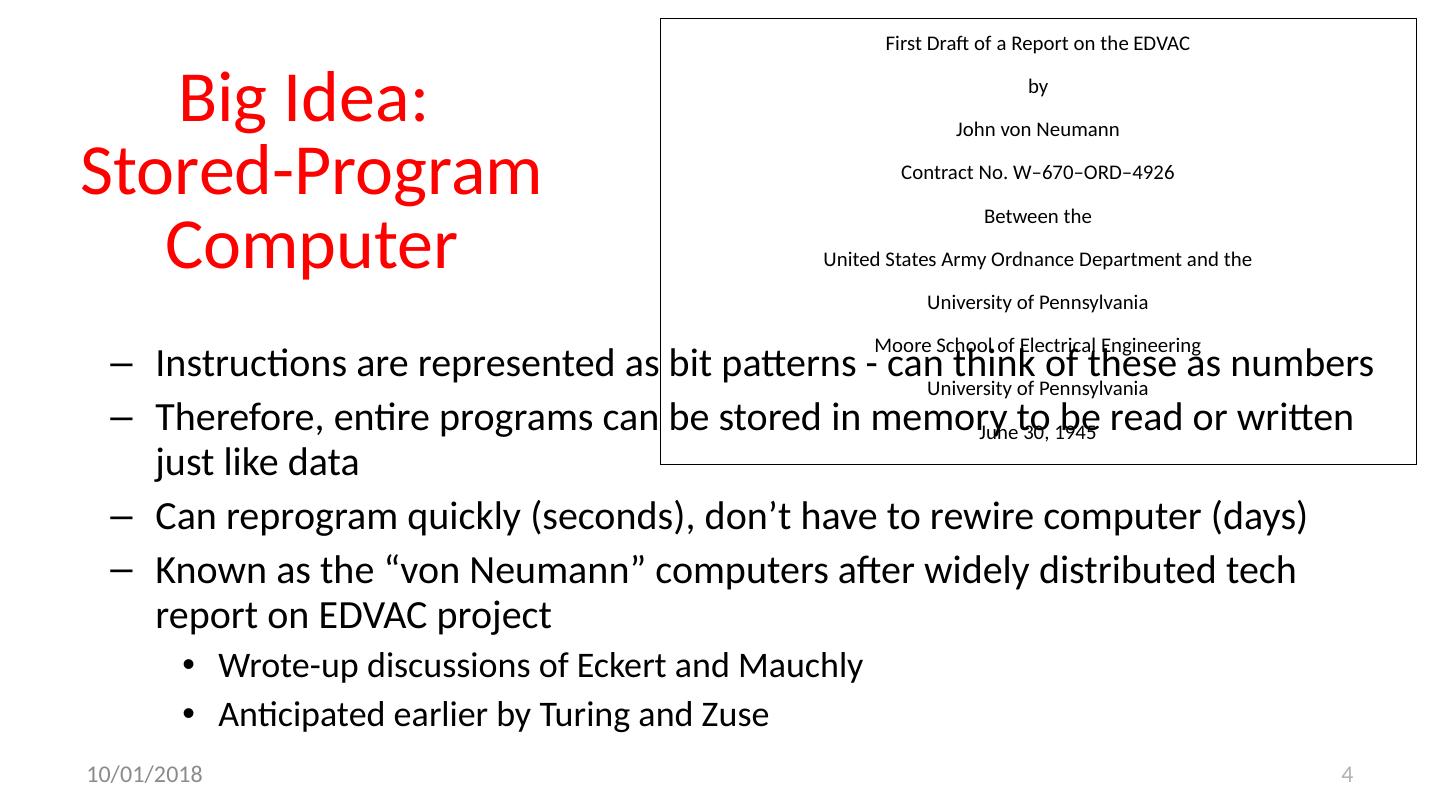 4 .Big Idea: Stored-Program Computer Instructions are represented as bit patterns - can think of these as numbers Therefore, entire programs can be stored in memory to be read or written just like data Can reprogram quickly (seconds), don’t have to rewire computer (days) Known as the “von Neumann” computers after widely distributed tech report on EDVAC project Wrote-up discussions of Eckert and Mauchly Anticipated earlier by Turing and Zuse First Draft of a Report on the EDVAC by John von Neumann Contract No. W–670–ORD– 4926 Between the United States Army Ordnance Department and the University of Pennsylvania Moore School of Electrical Engineering University of Pennsylvania June 30, 1945 9/14/17 4