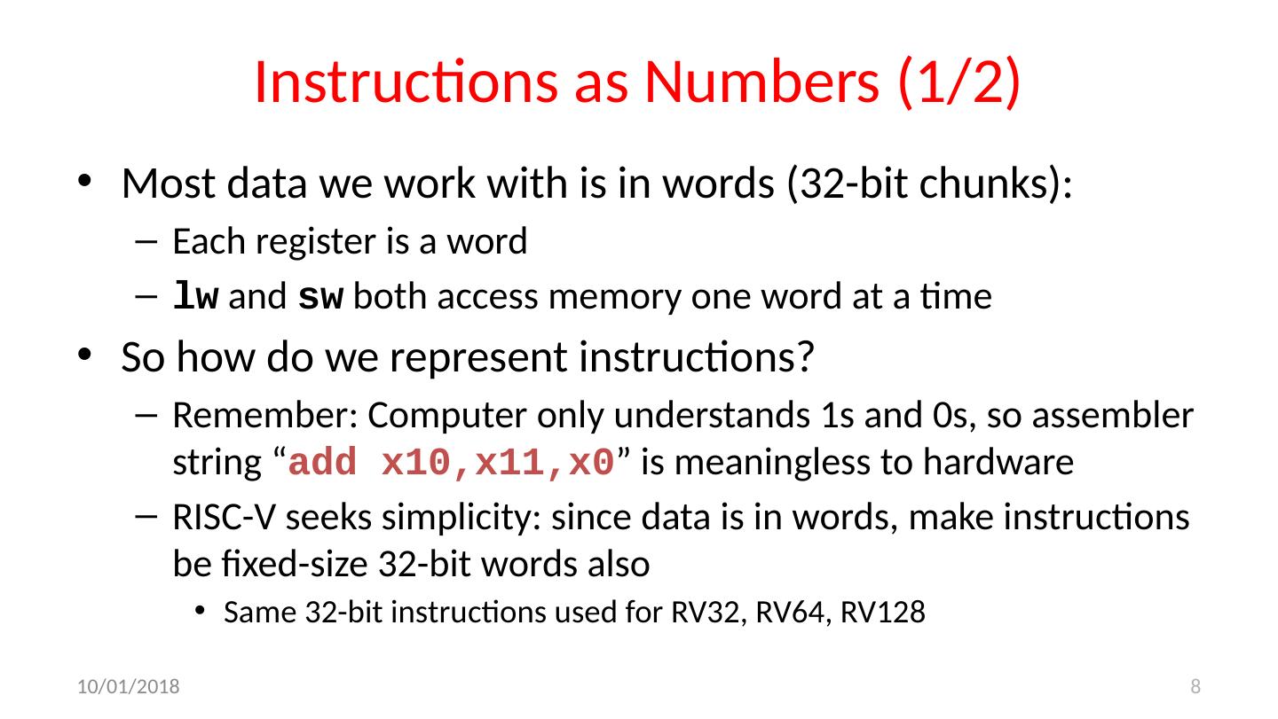 8 .Instructions as Numbers (1/2) Most data we work with is in words (32-bit chunks): Each register is a word lw and sw both access memory one word at a time So how do we represent instructions? Remember: Computer only understands 1s and 0s, so assembler string “ add x10,x11,x0 ” is meaningless to hardware RISC-V seeks simplicity: since data is in words, make instructions be fixed-size 32-bit words also Same 32-bit instructions used for RV32, RV64, RV128 8 9/14/17