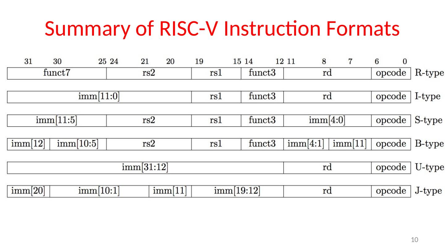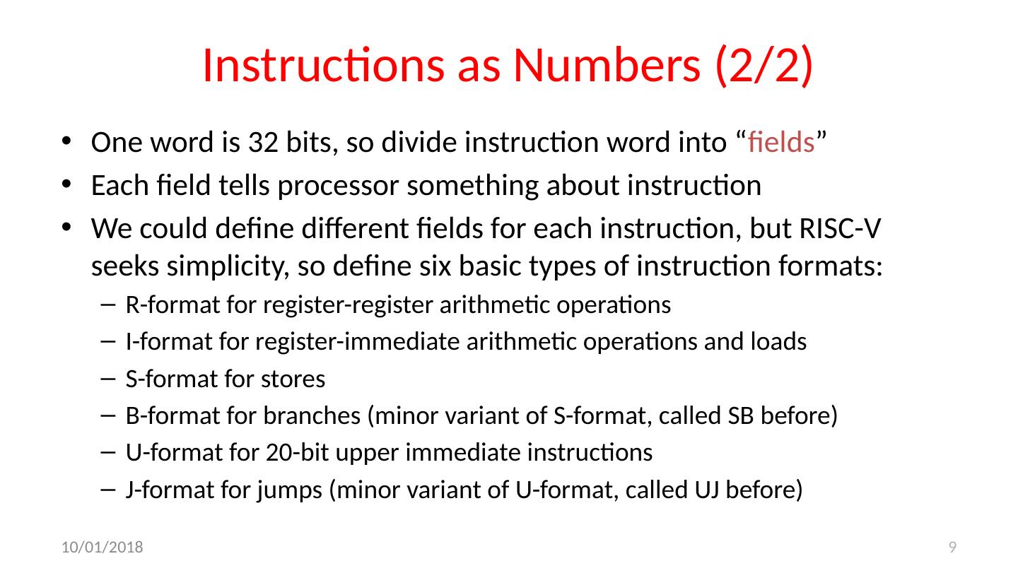 9 .Instructions as Numbers (2/2) One word is 32 bits, so divide instruction word into “ fields ” Each field tells processor something about instruction We could define different fields for each instruction, but RISC-V seeks simplicity, so define six basic types of instruction formats: R-format for register-register arithmetic operations I-format for register-immediate arithmetic operations and loads S -format for stores B-format for branches (minor variant of S-format, called SB before) U-format for 20-bit upper immediate instructions J-format for jumps (minor variant of U- format, called UJ before) 9/14/17 9