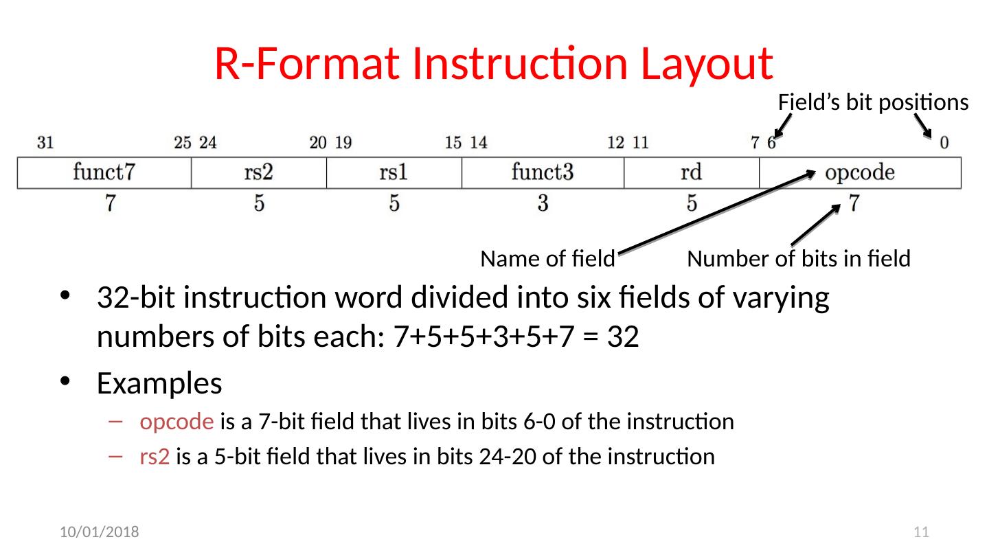 11 .R-Format Instruction Layout 32-bit instruction word divided into six fields of varying numbers of bits each: 7+5+5+3+5+7 = 32 Examples opcode is a 7-bit field that lives in bits 6-0 of the instruction rs2 is a 5- bit field that lives in bits 24-20 of the instruction 11 9/14/17 Field’s bit positions Number of bits in field Name of field