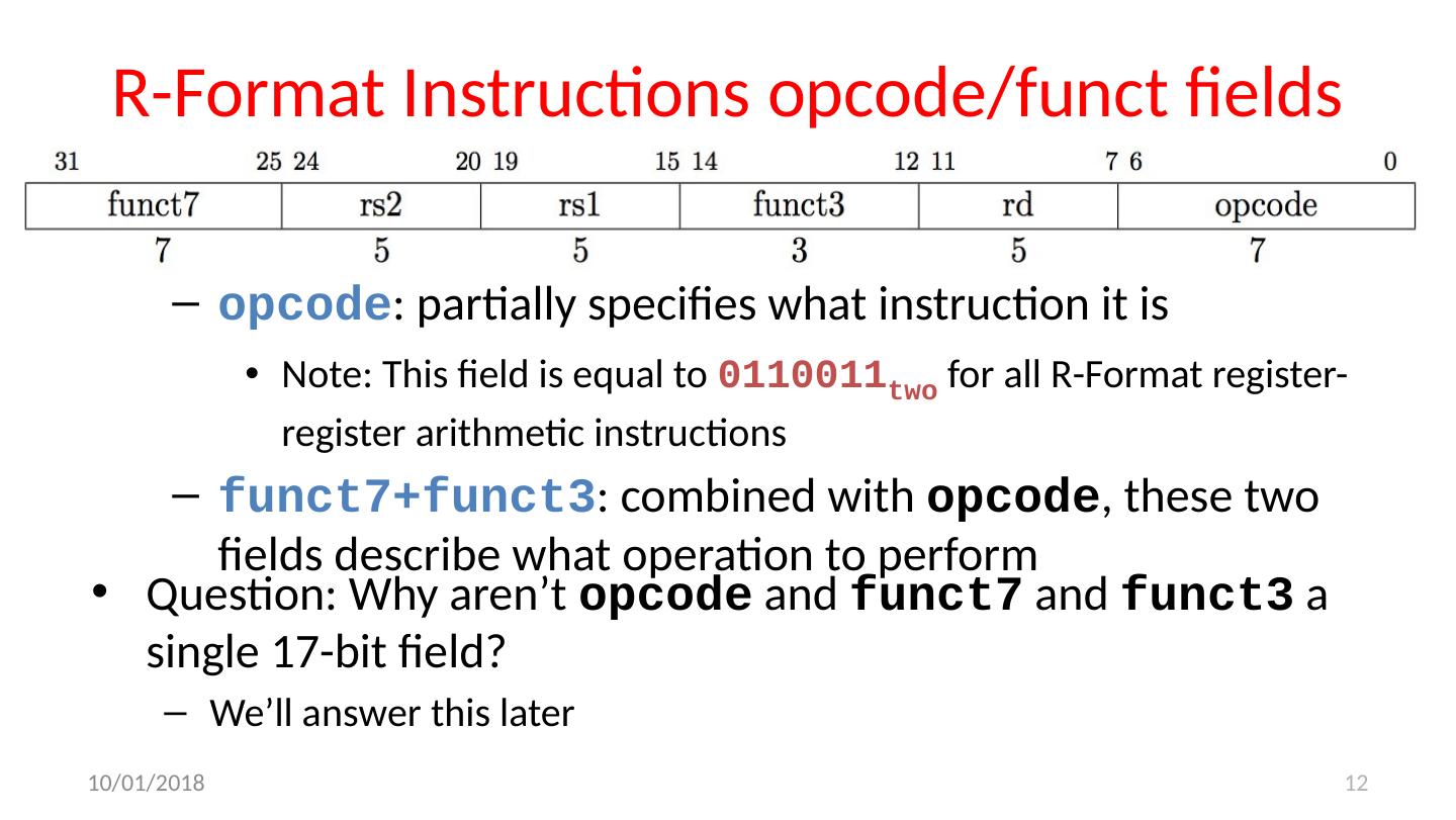 12 .R-Format Instructions opcode / funct fields opcode : partially specifies what instruction it is Note: This field is equal to 0110011 two for all R-Format register-register arithmetic instructions funct7+funct3 : combined with opcode , these two fields describe what operation to perform 12 Question: Why aren’t opcode and funct7 and funct3 a single 17-bit field? We’ll answer this later 9/14/17