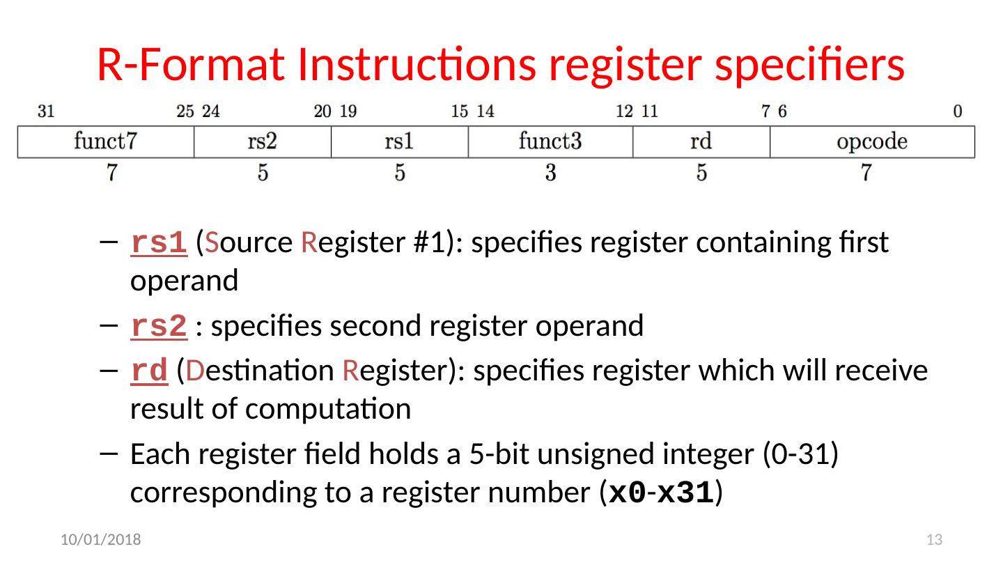 13 .R-Format Instructions register specifiers rs1 ( S ource R egister #1) : specifies register containing first operand rs2 : specifies second register operand rd ( D estination R egister): specifies register which will receive result of computation Each register field holds a 5-bit unsigned integer ( 0- 31) corresponding to a register number ( x0 - x31 ) 13 9/14/17