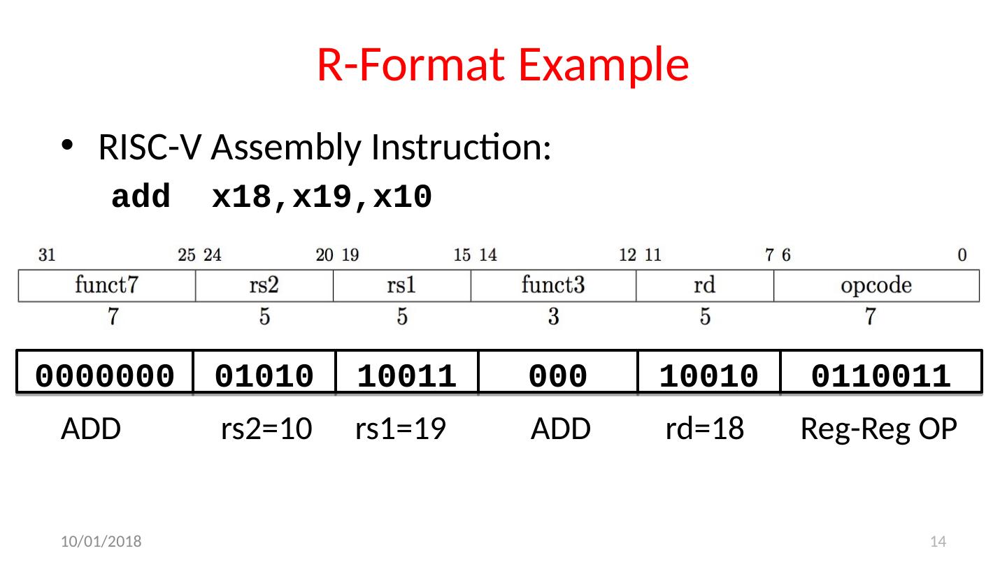 14 .R-Format Example RISC-V Assembly Instruction: add x18,x19,x10 14 9/14/17 0000000 01010 1 0 011 000 10010 0110011 Reg-Reg OP r d =18 ADD ADD r s2=10 rs1=19